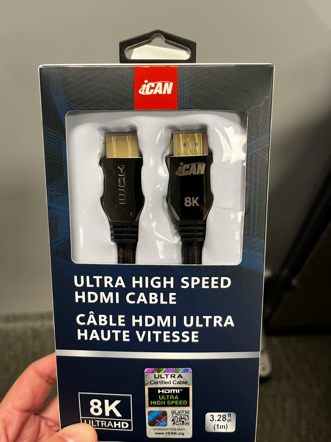 Selling a iCan Ultra High Speed HDMI Cable! It supports 8K resolution and is 3.28 ft (1m) long. Comes in its original packaging.