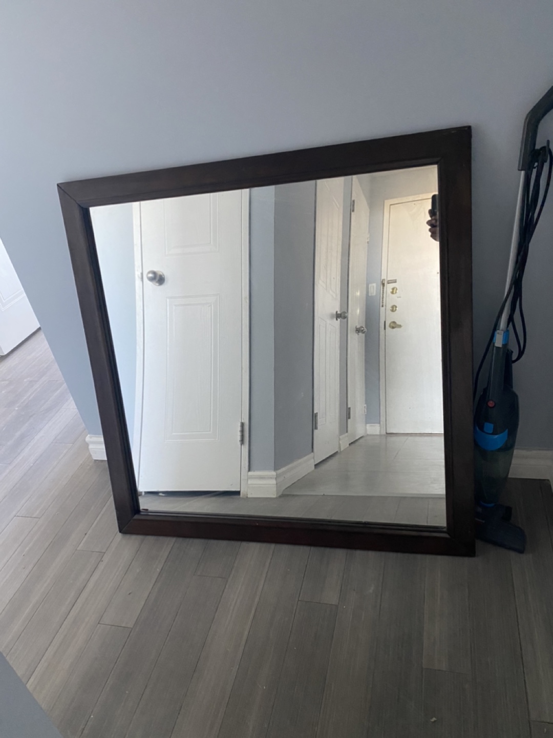 Selling a framed square wall mirror. 40.5 by 40.5 It's in good condition and ready to brighten up your space!