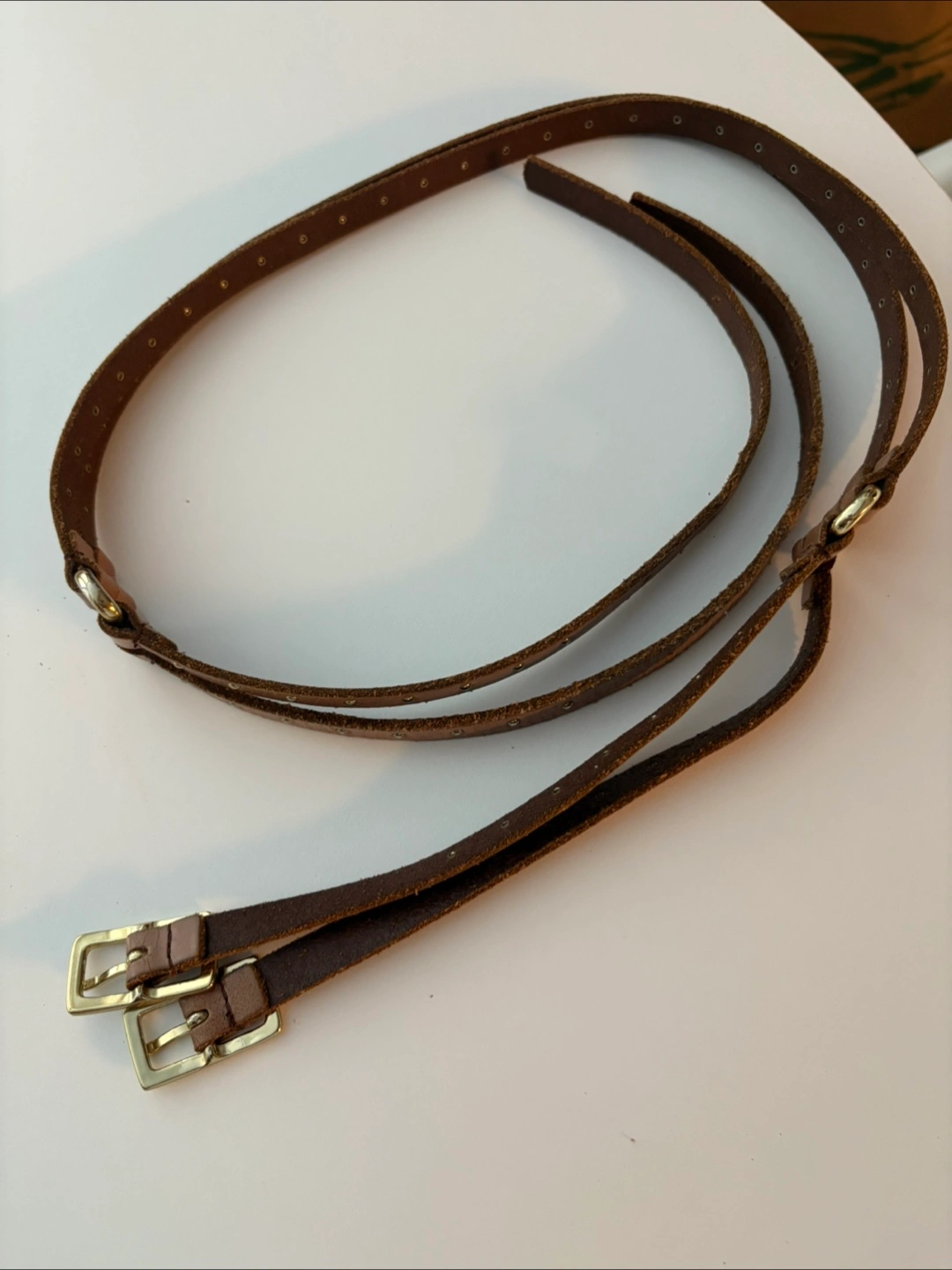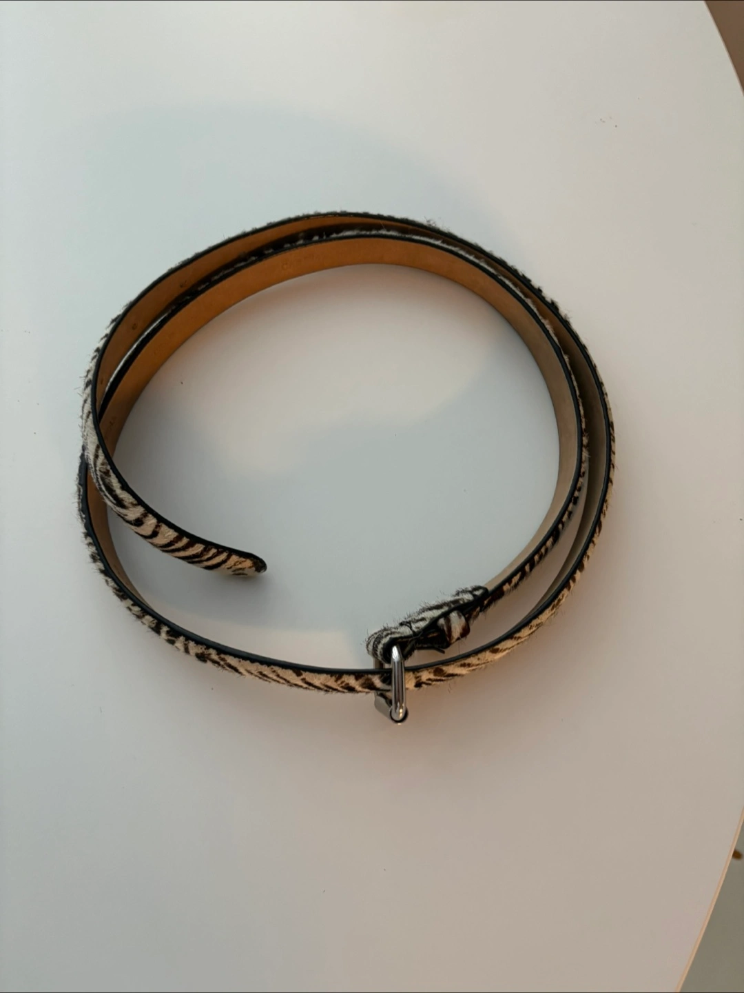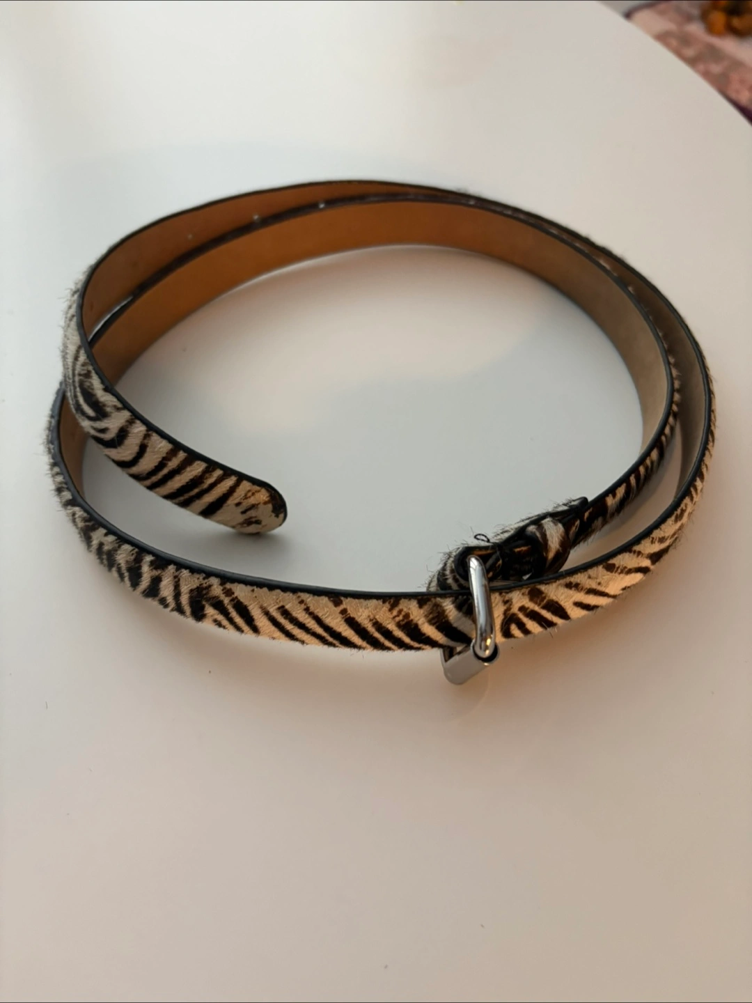 One is a brown leather belt with gold hardware and studded detailing. The other is a zebra print belt with silver hardware.
