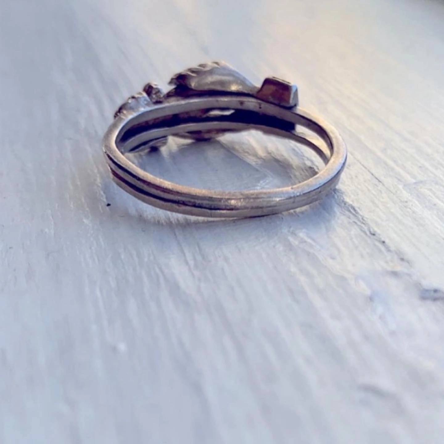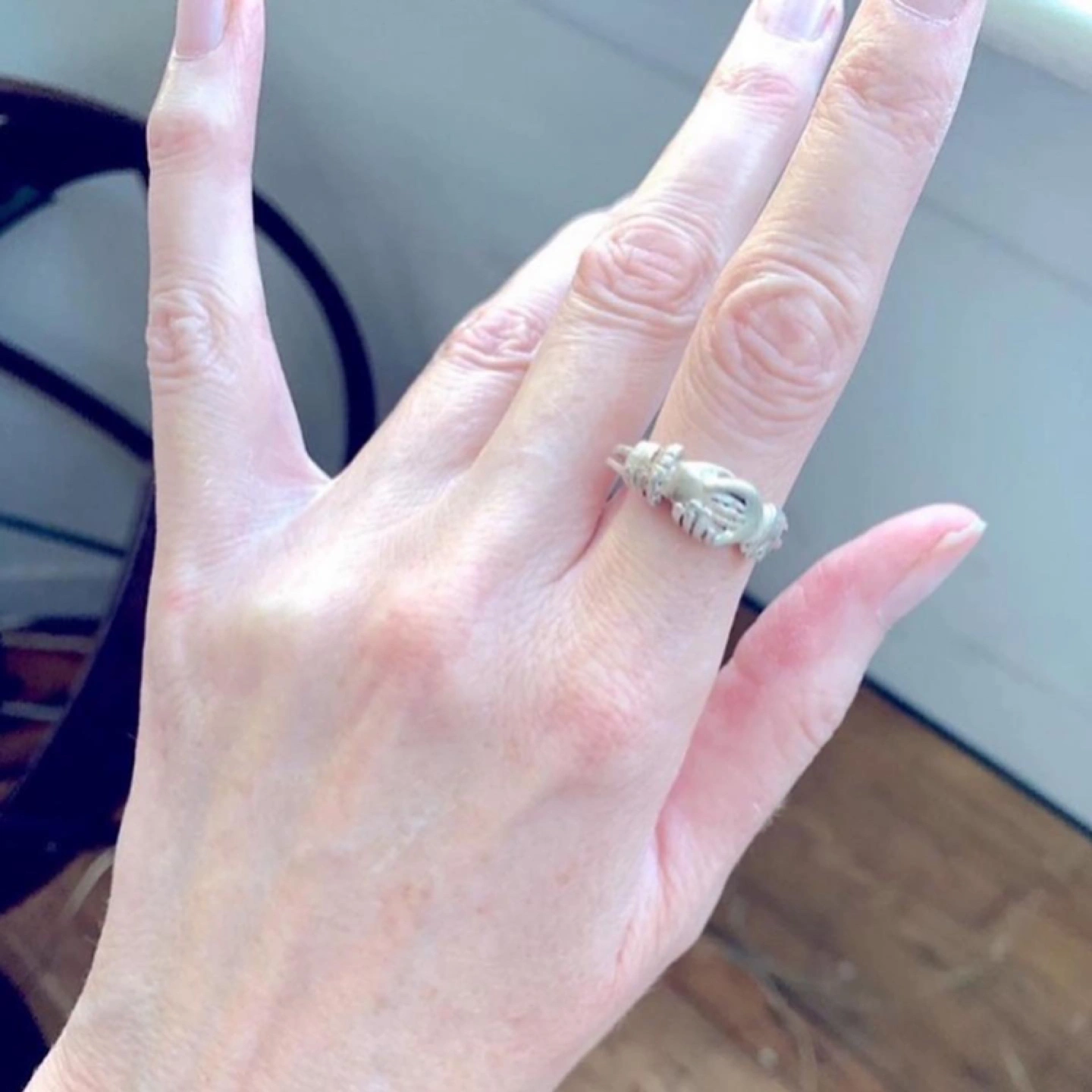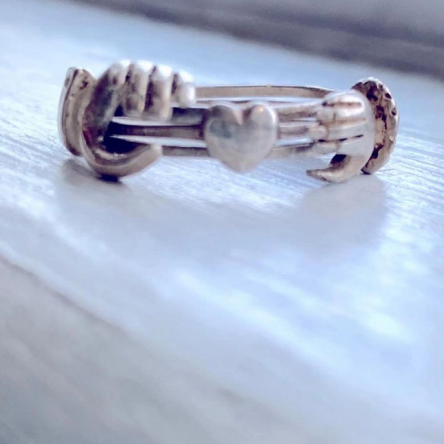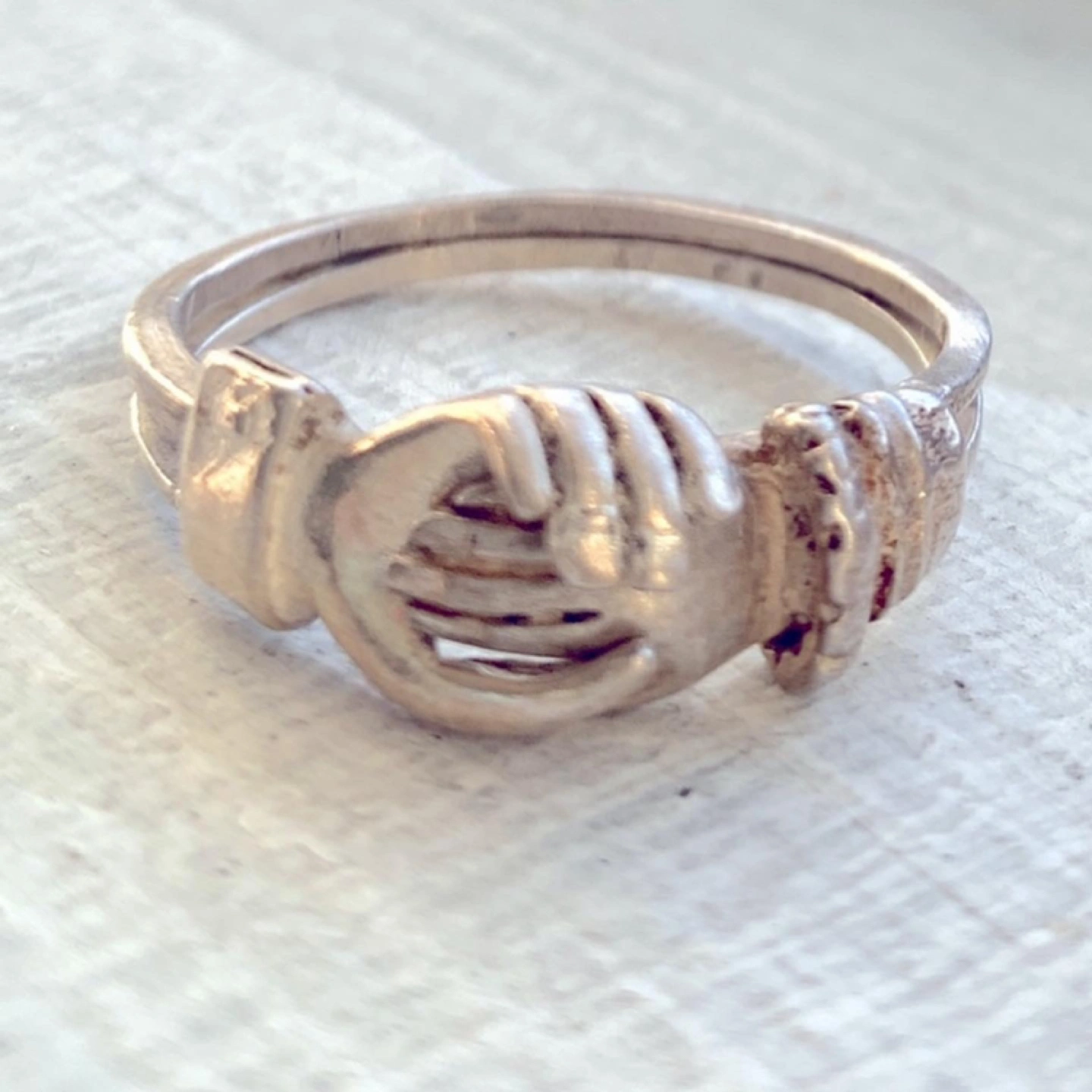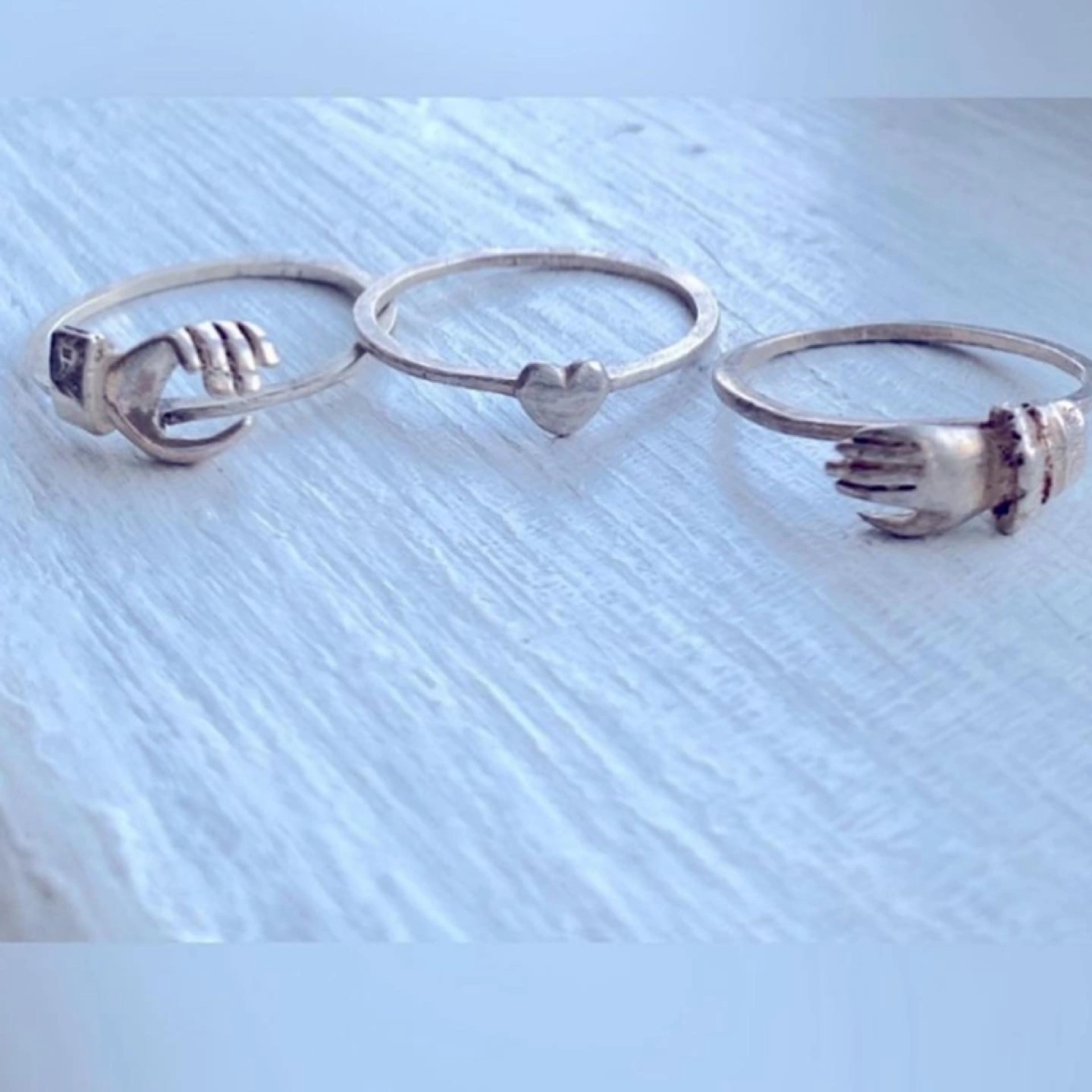 So I have been the proud owner of 2/3rds of this set for the last 20 years and just this morning (looking for some thing else entirely) I found the missing piece 🙋♀️❤️🙏 Sterling Silver Holding Hands Ring, Silver Claddagh ring,Hands Clasped Secret Heart, Love Ring, Hold Your Hand, Hold your Heart❤️Really There are no words to say how brilliant this little set is. But I’ll explain it anyway❤️Vintage solid sterling silver has good weight, not flimsy ❤️there is a male hand and a female hand differentiated by the cuff of the sleeve at the wrist of the hand🦋 The third ring is a heart❤️the three latch together to form one ring. 🦋 From the sweet 1960’s❤️perfect and in beautiful condition.🦋 size 8.5 or 9ish🦋 can be easily sized up or down❤️