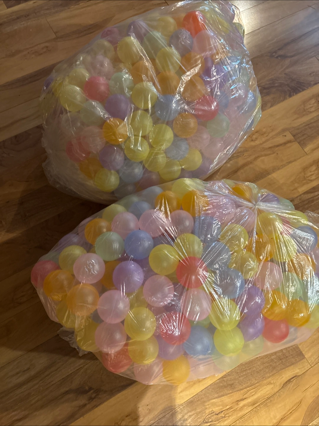 Selling two bags of colourful plastic balls. They are perfect for a ball pit or play area for kids. Each bag is full and ready for a new home!
