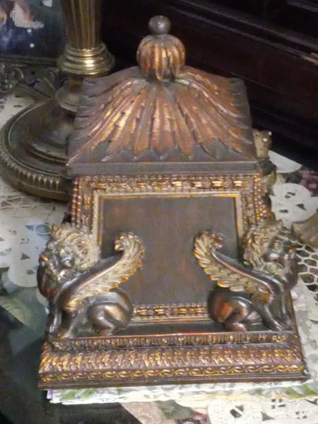 Selling a unique decorative box. It features intricate details and winged dogs on each corner with felt underpad and a carved lid with a finial for easy opening. I've had this ? Don't know what to call it..box doesn't do it justice. I've had it for about 20 years. "well cared for"