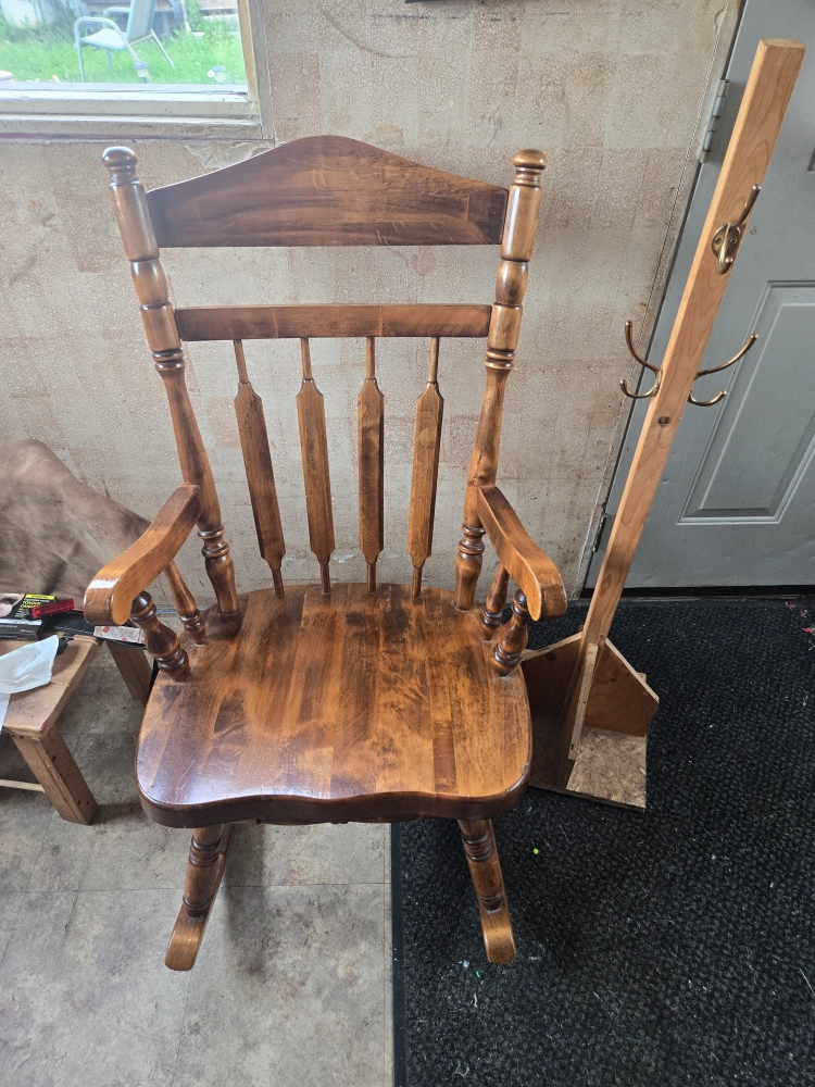 Gently used wooden rocking chair in good condition. It has a sturdy build and a classic design. One picture shows the chair with a blue padded seat.