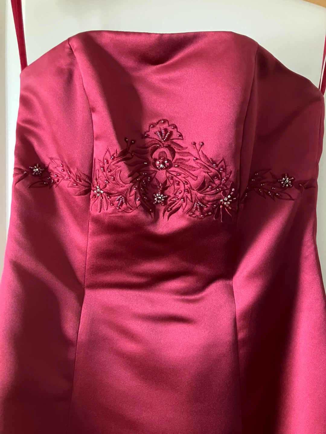 This is a striking strapless gown from Bella Formals. It features intricate beading on the bodice and a full floor length skirt. The colour is a rich cranberry shade. Worn once. From a smoke-free, bug free, dog friendly home. Perfect for formal events or weddings!
