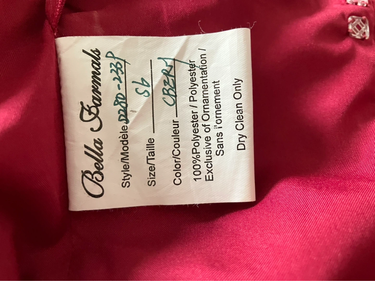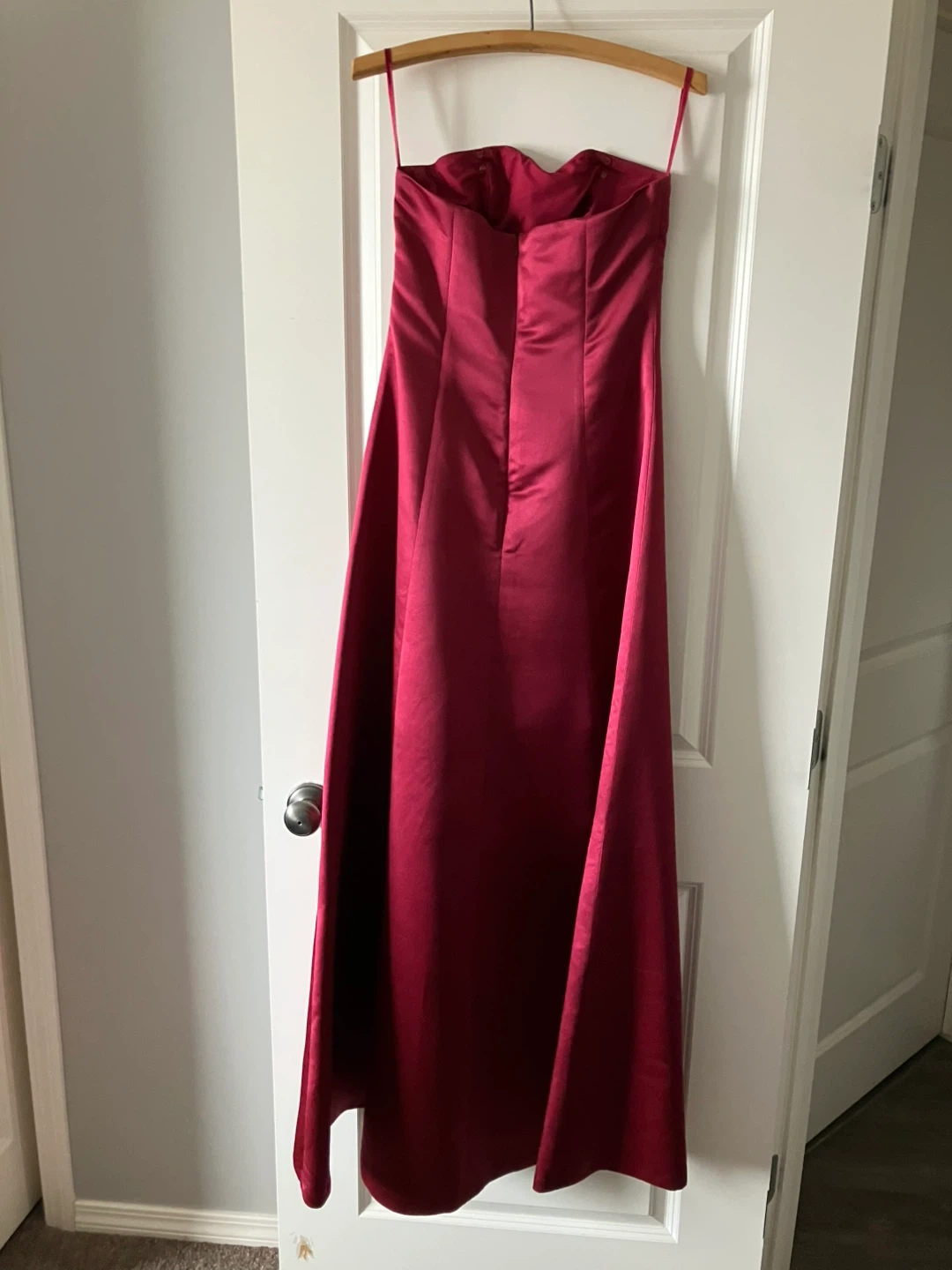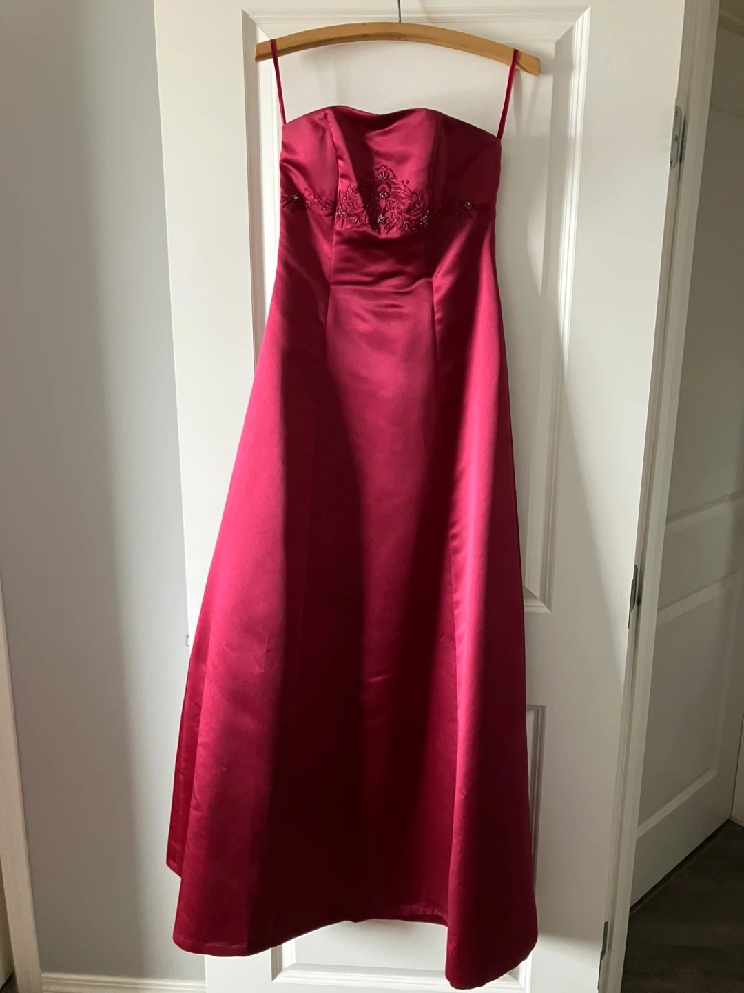 This is a striking strapless gown from Bella Formals. It features intricate beading on the bodice and a full floor length skirt. The colour is a rich cranberry shade. Worn once. From a smoke-free, bug free, dog friendly home. Perfect for formal events or weddings!