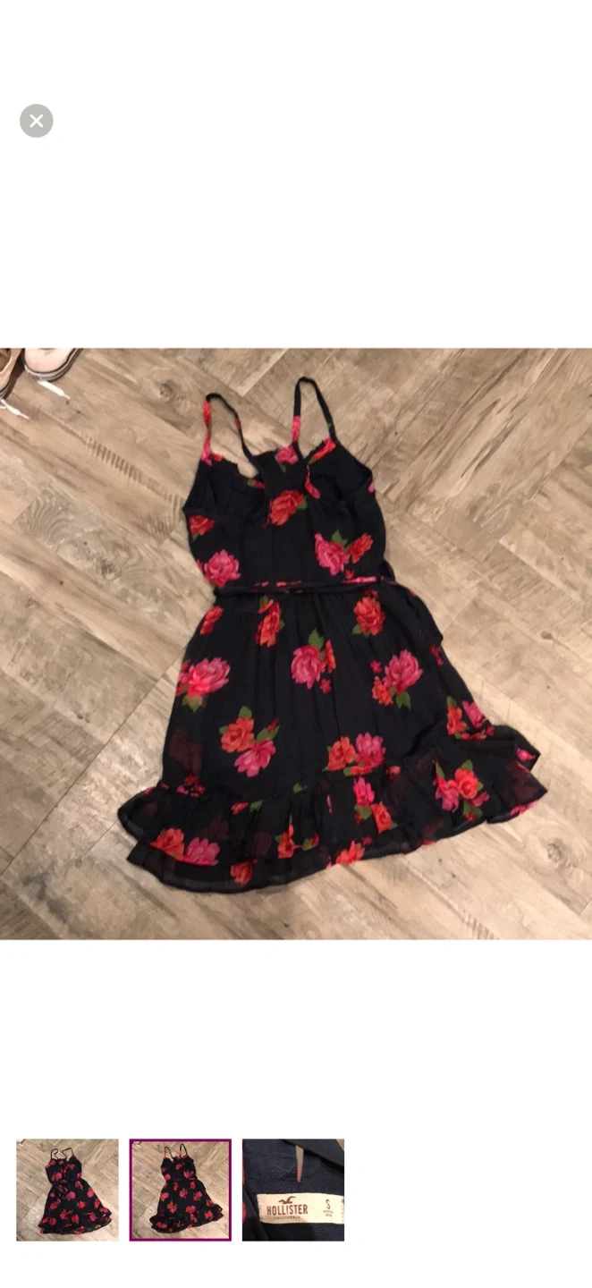 This Hollister dress features a black background with a vibrant pink and red floral print. It's a size small with adjustable straps and a ruffled hem. The shell is 100% polyester, and the lining is cotton/cotton blend. Perfect for warm weather outings!