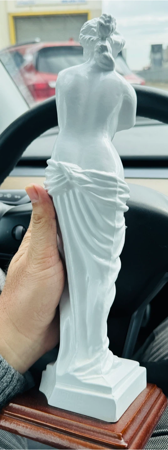 This is a white statue of Venus. It's a decorative figurine for your home or office. The base is a glossy dark wood.