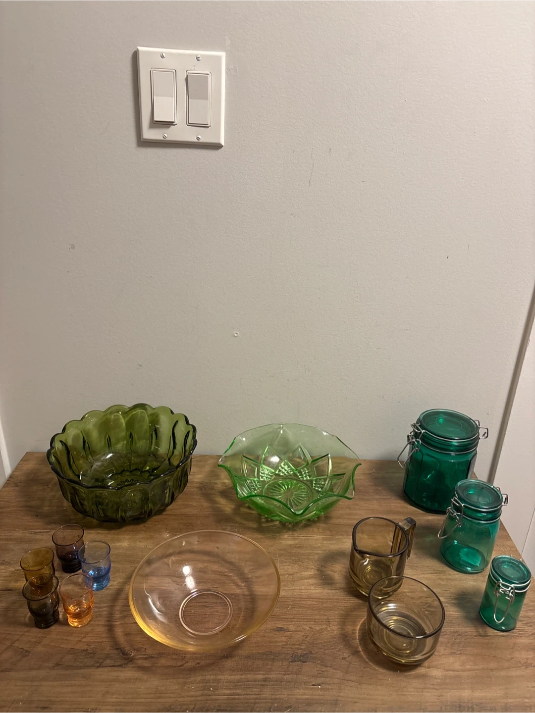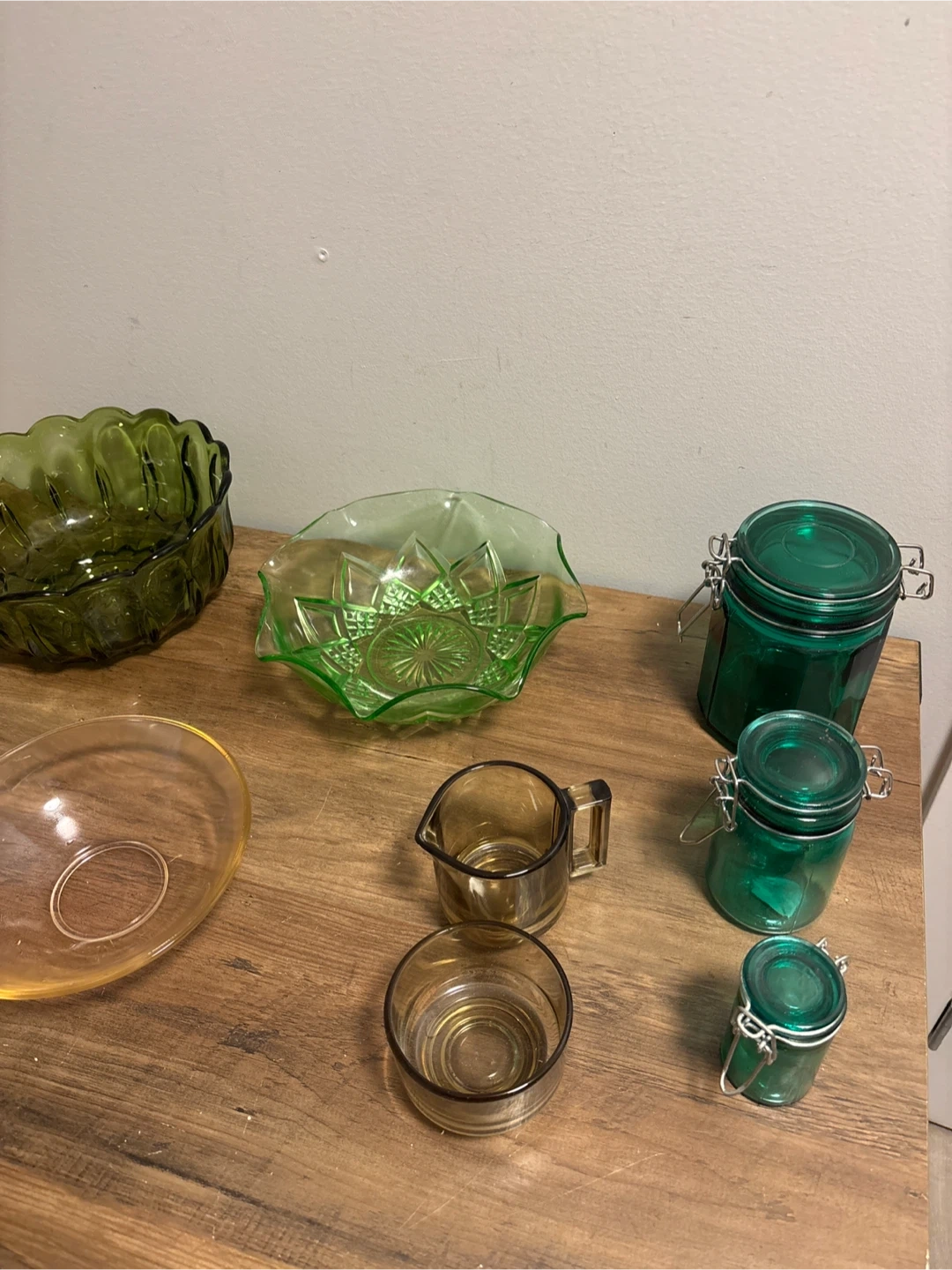 This set includes a large green fluted bowl and a smaller green starburst bowl, perfect for serving or display. It also comes with three green glass lidded jars for storage and a collection of amber and blue shot glasses. Additional items include a clear glass serving bowl and a small amber creamer. These pieces add a pop of colour to any kitchen or dining setting!