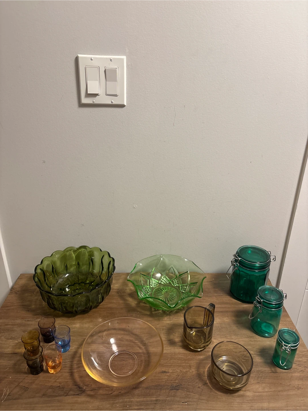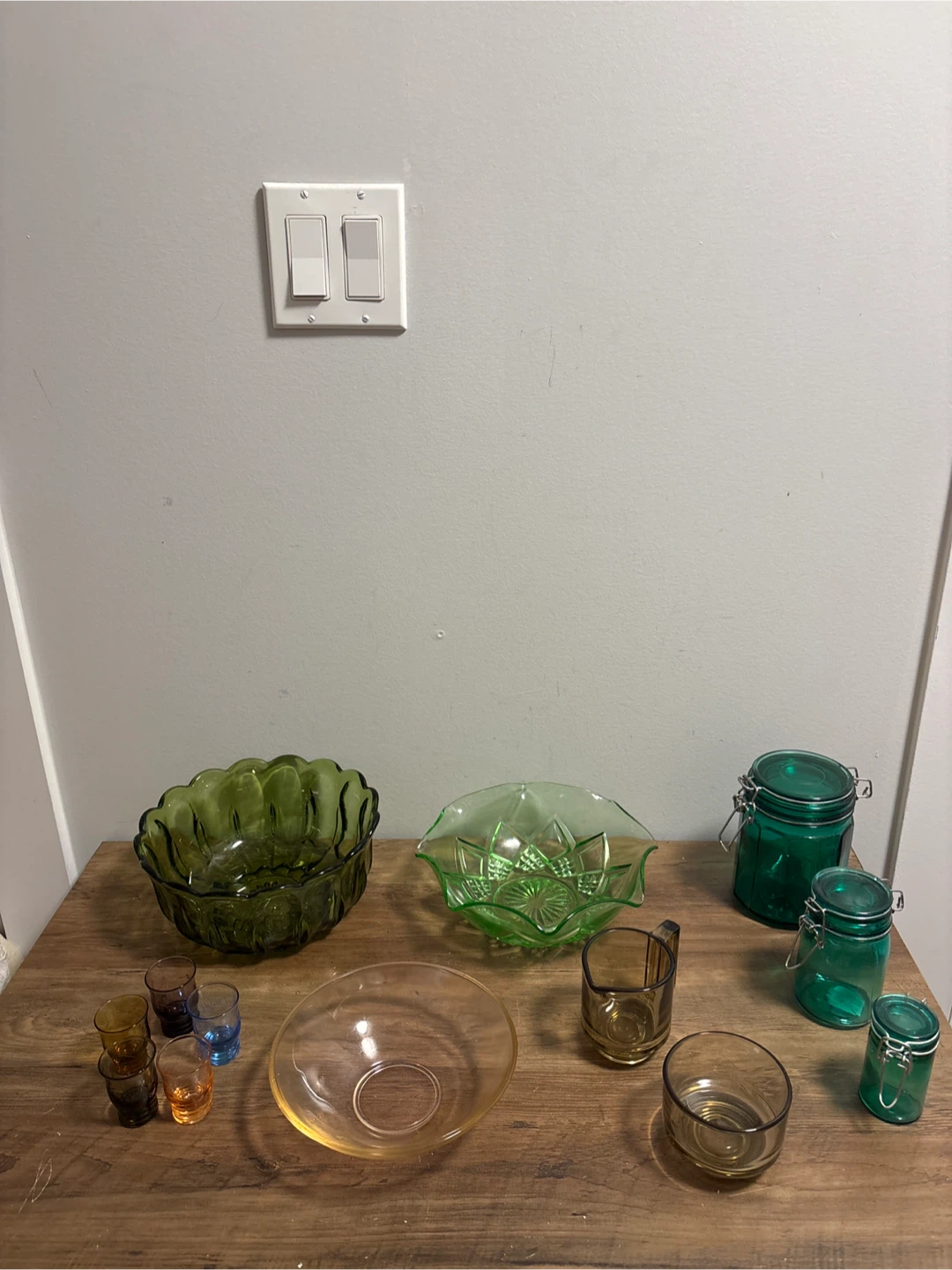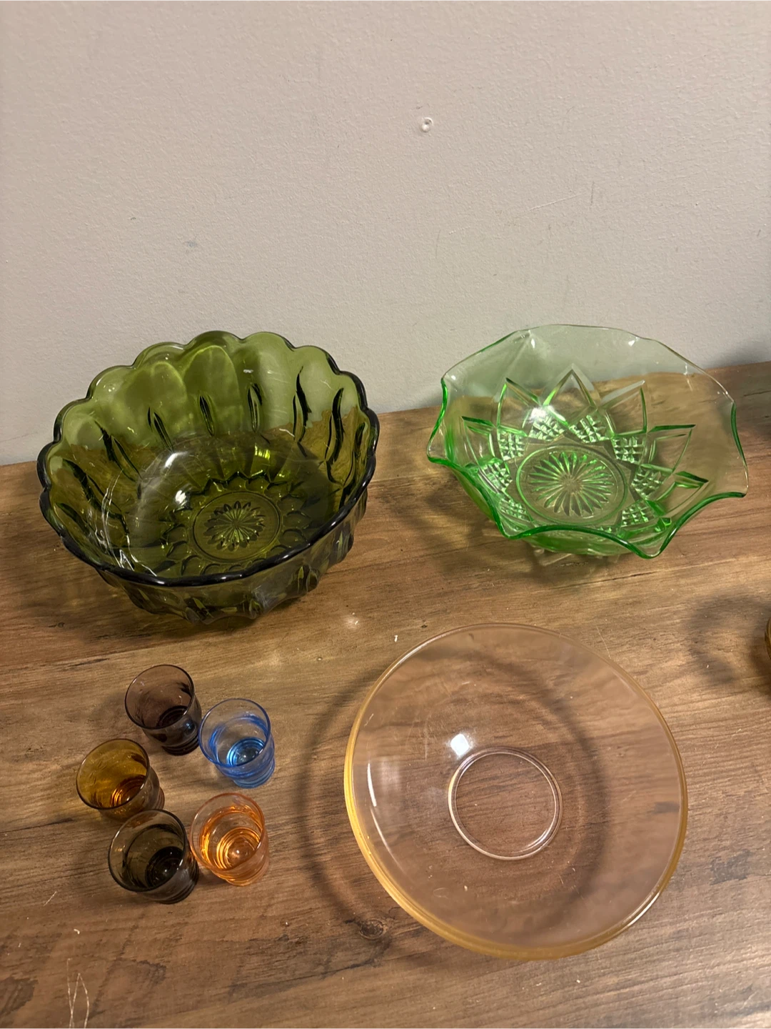 This set includes a large green fluted bowl and a smaller green starburst bowl, perfect for serving or display. It also comes with three green glass lidded jars for storage and a collection of amber and blue shot glasses. Additional items include a clear glass serving bowl and a small amber creamer. These pieces add a pop of colour to any kitchen or dining setting!