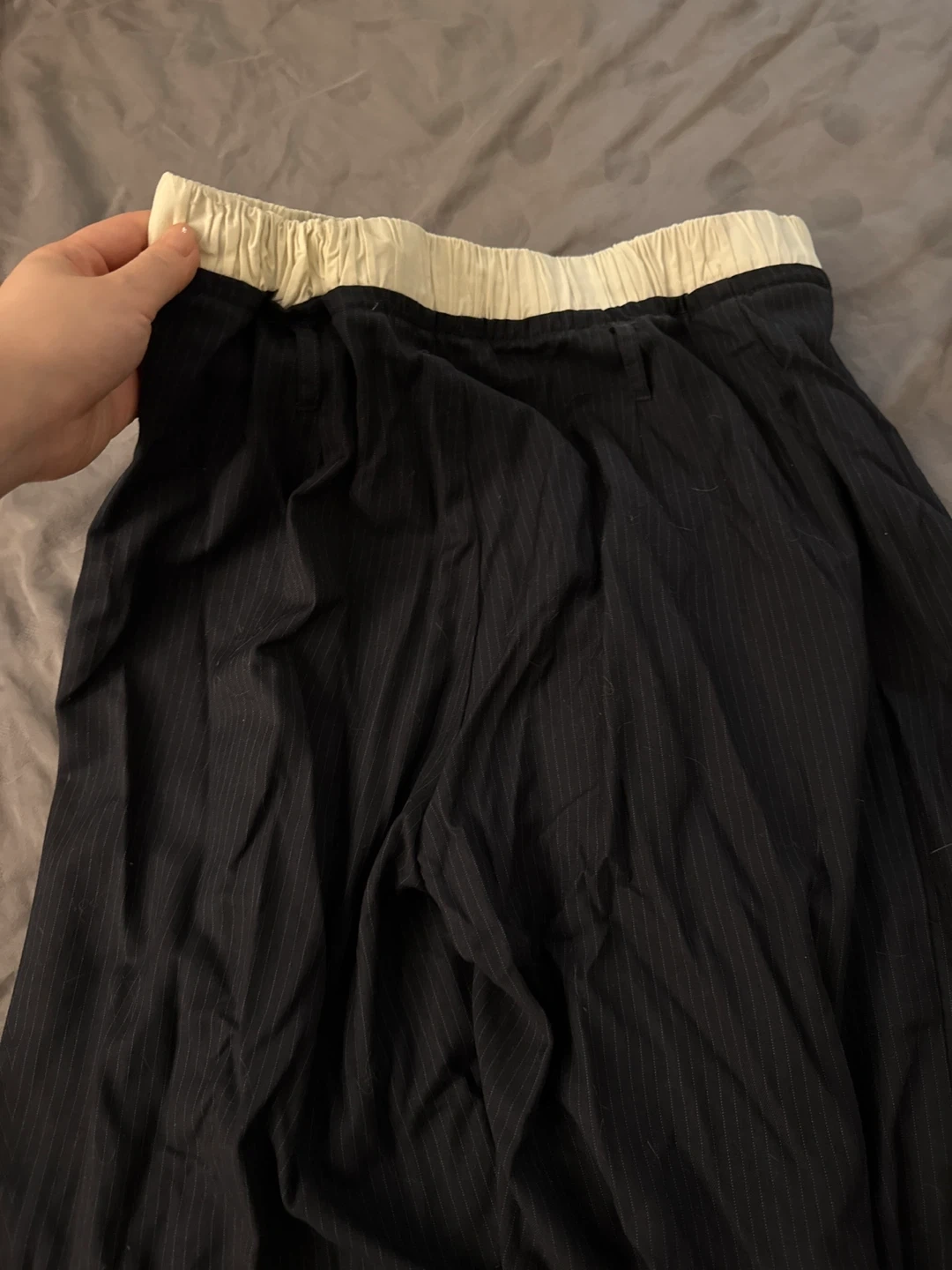 ZARA black wide leg pants with a pinstripe pattern. Elastic waistband for comfort. Made in China. Size S (EUR S, USA 4/6).