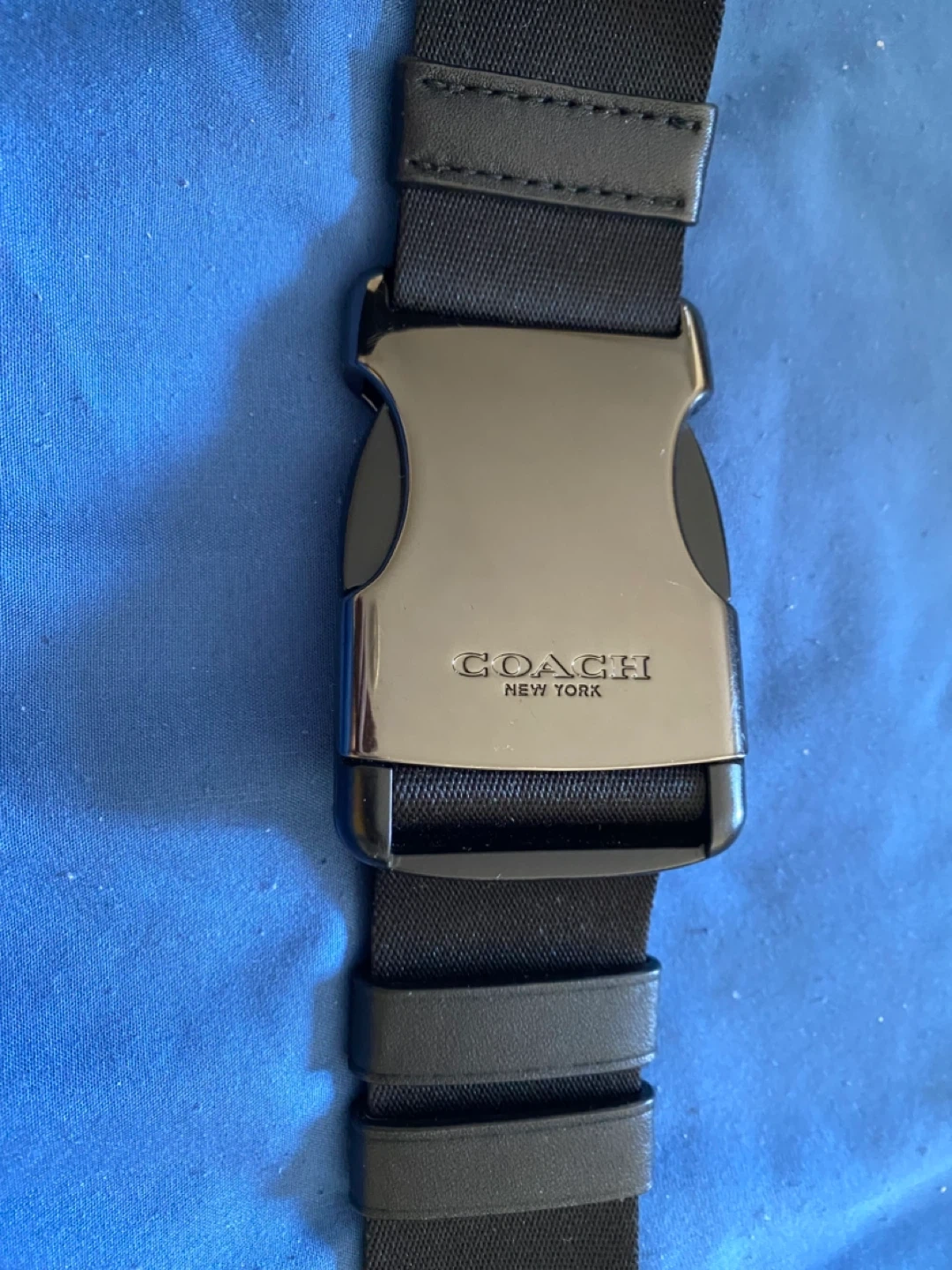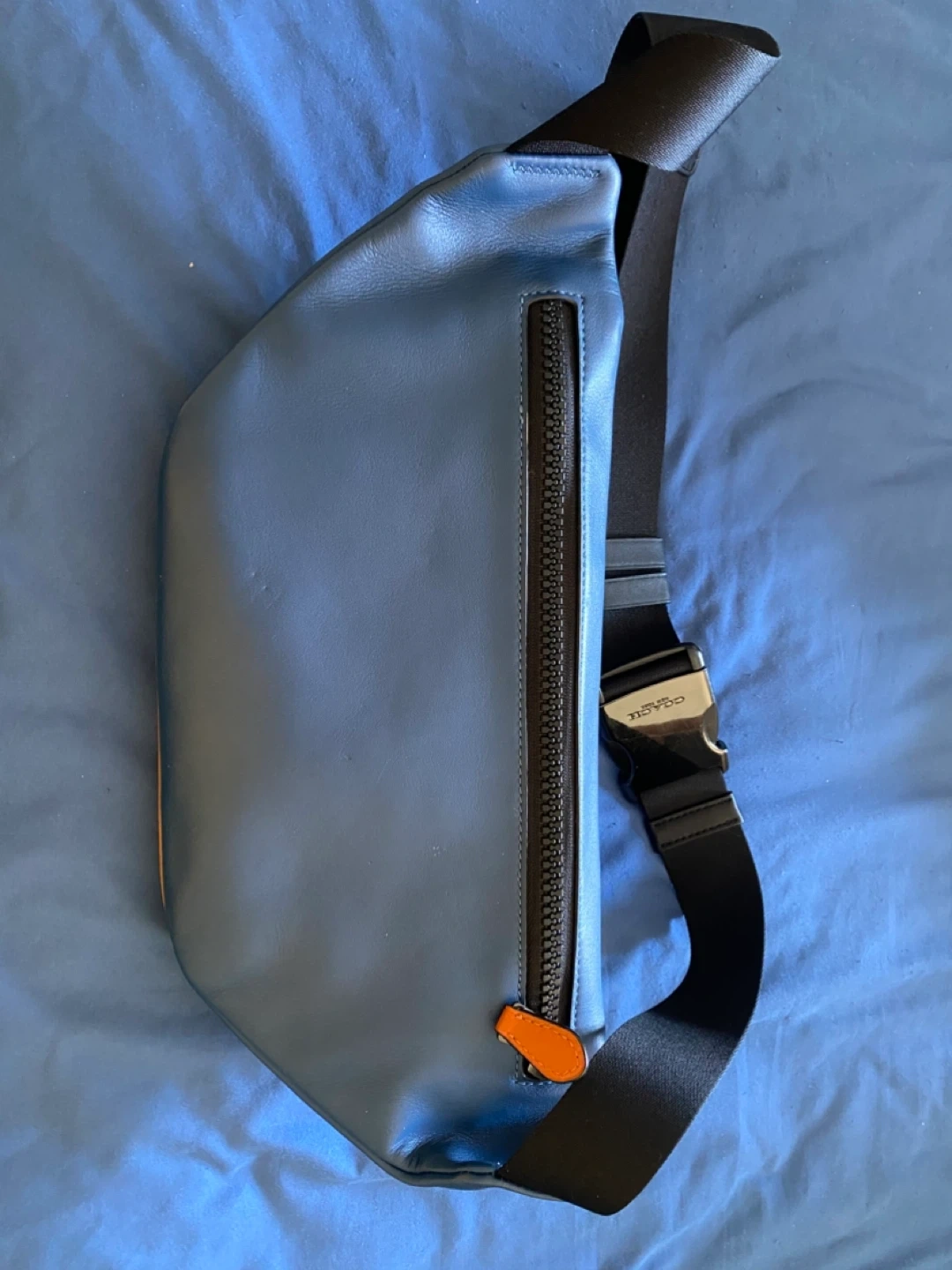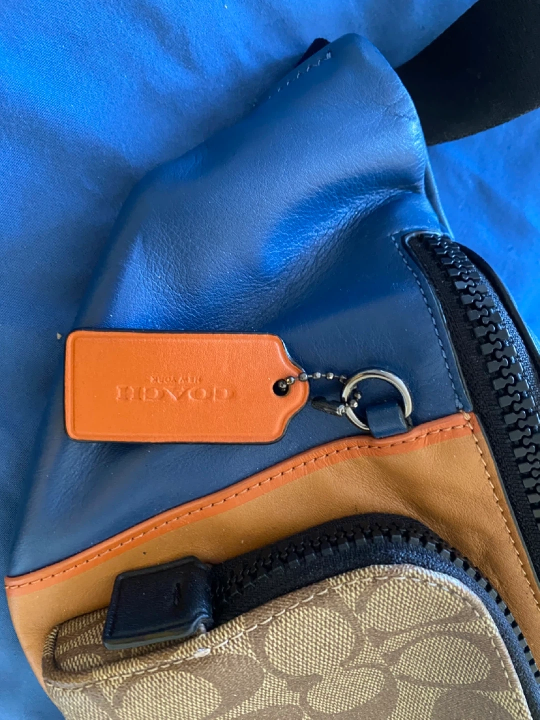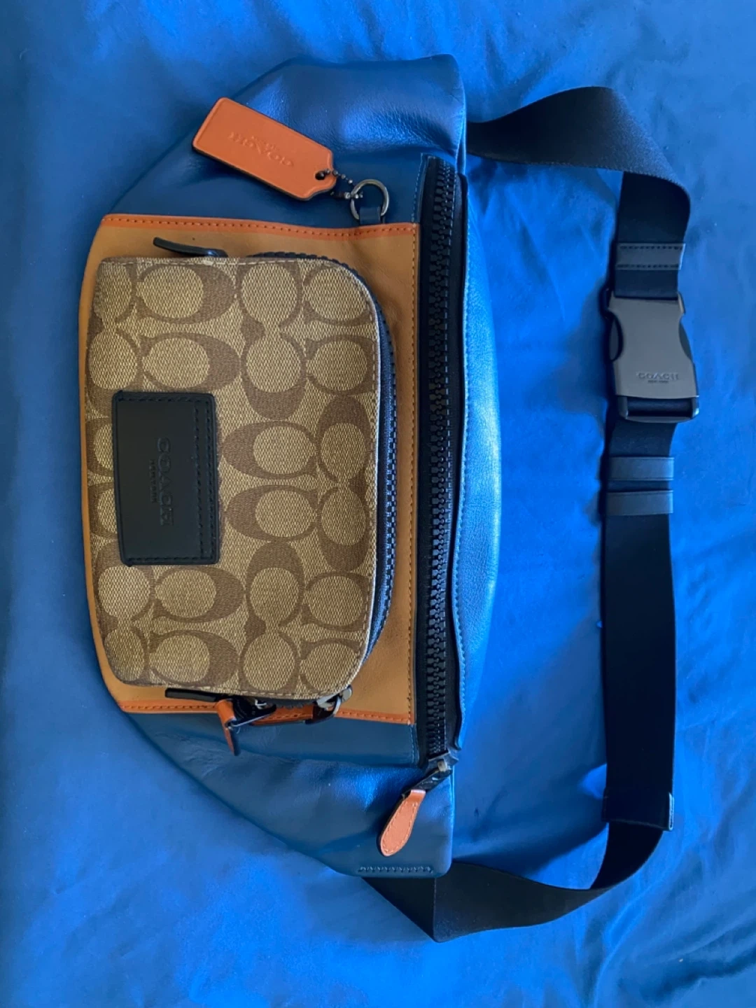 This is a Coach belt bag in blue and tan. It features the signature Coach logo pattern on a front pocket and a zip closure. Adjustable strap with a clip buckle.