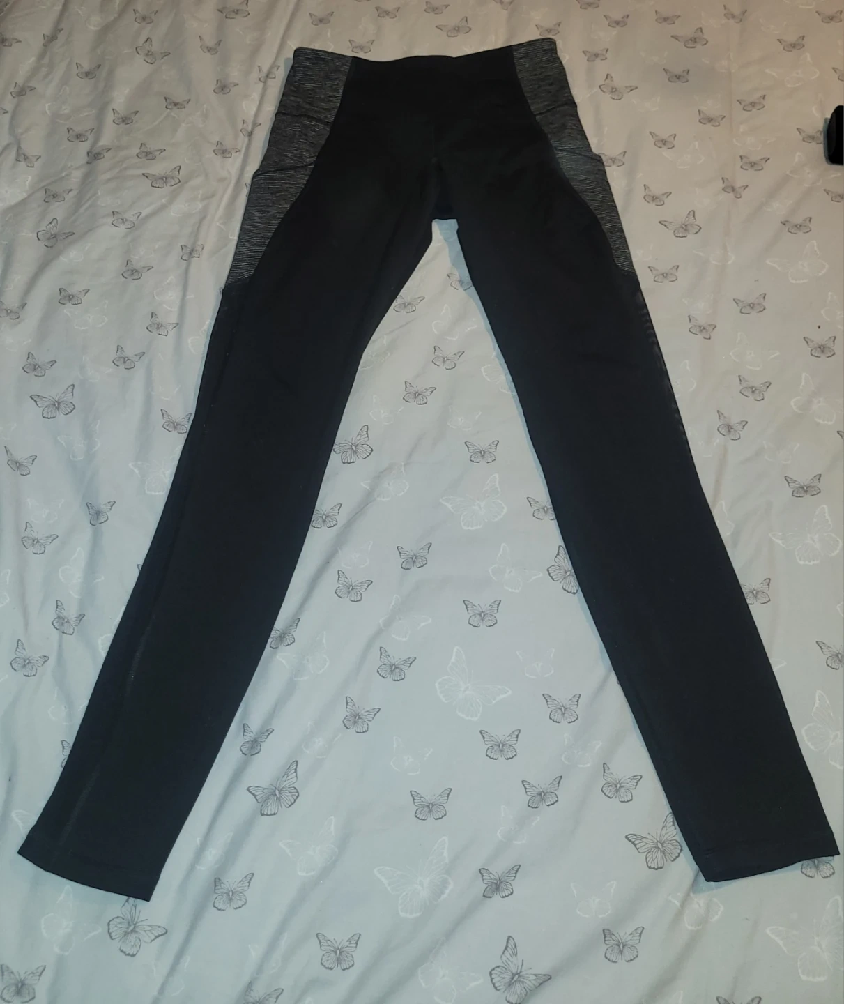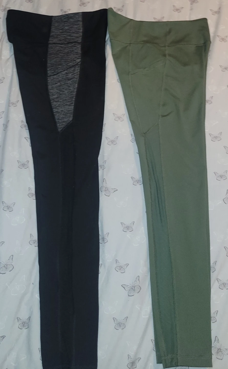Two pairs of Old Navy Active leggings in size medium. One pair is olive green and the other is black with grey accents. Both feature side pockets.