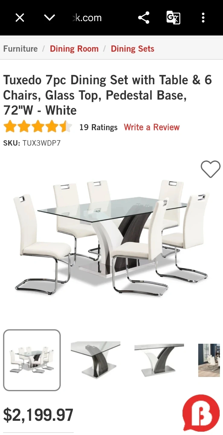 This dining set includes a glass-top table with a white pedestal base and six white chairs with chrome legs. Seats six people comfortably. Perfect for family dinners or entertaining guests!