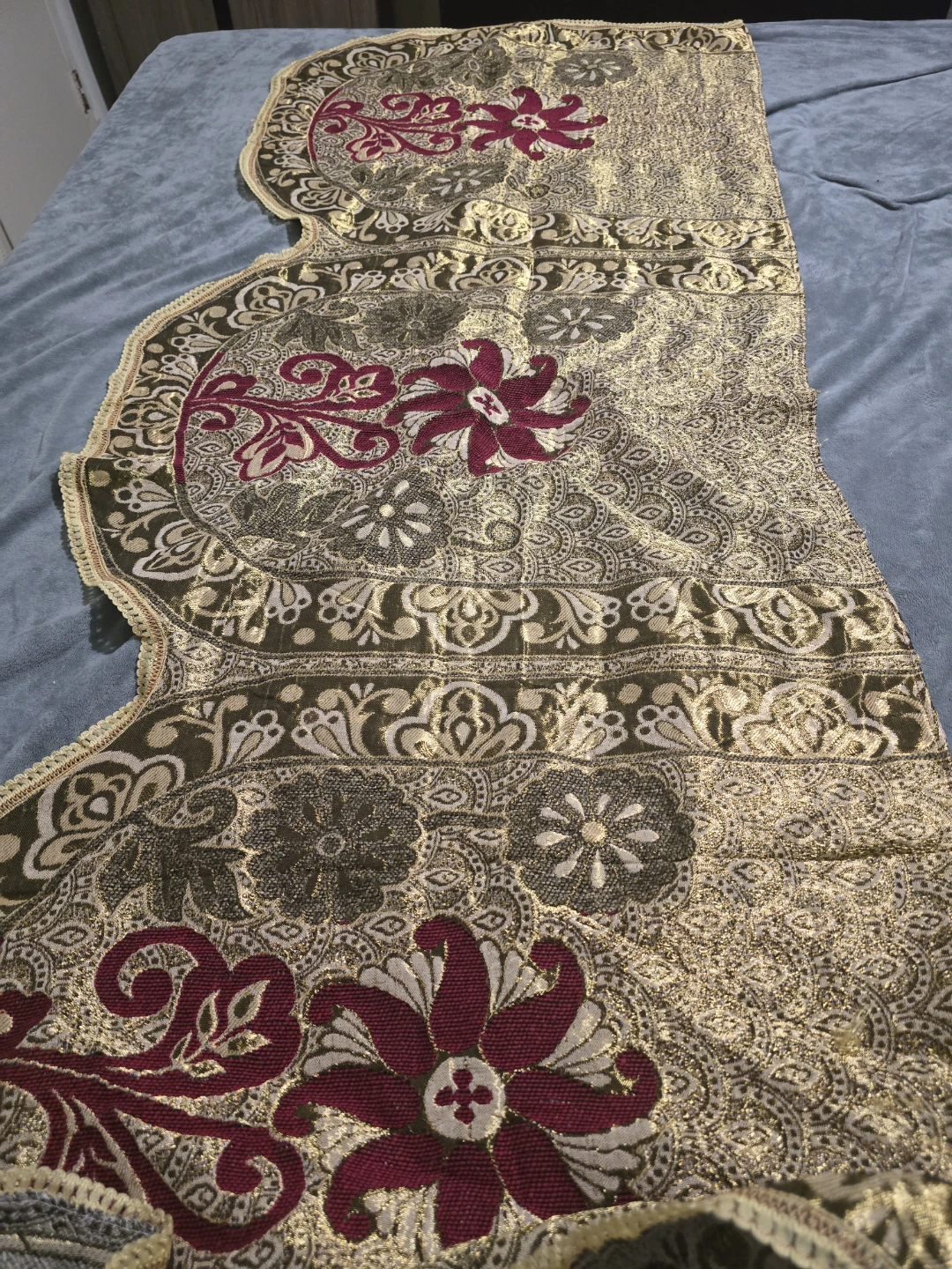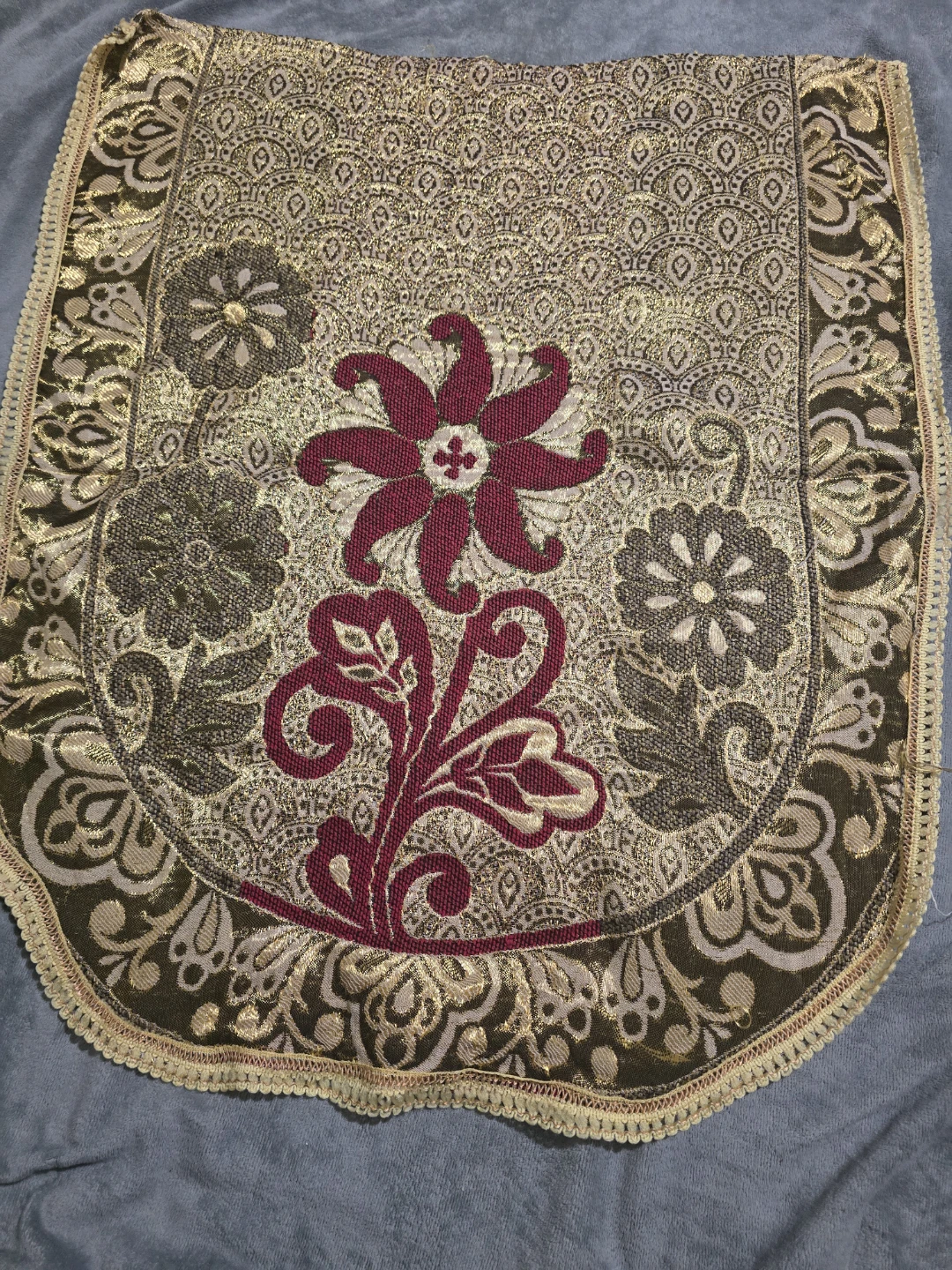 A decorative fabric cover for your couch, featuring a rich floral design in gold and maroon. It's designed to protect furniture and add a touch of elegance. Fabric material. It has 10 pieces of cover which gives a elegant look to your sofa, and its been use only once.