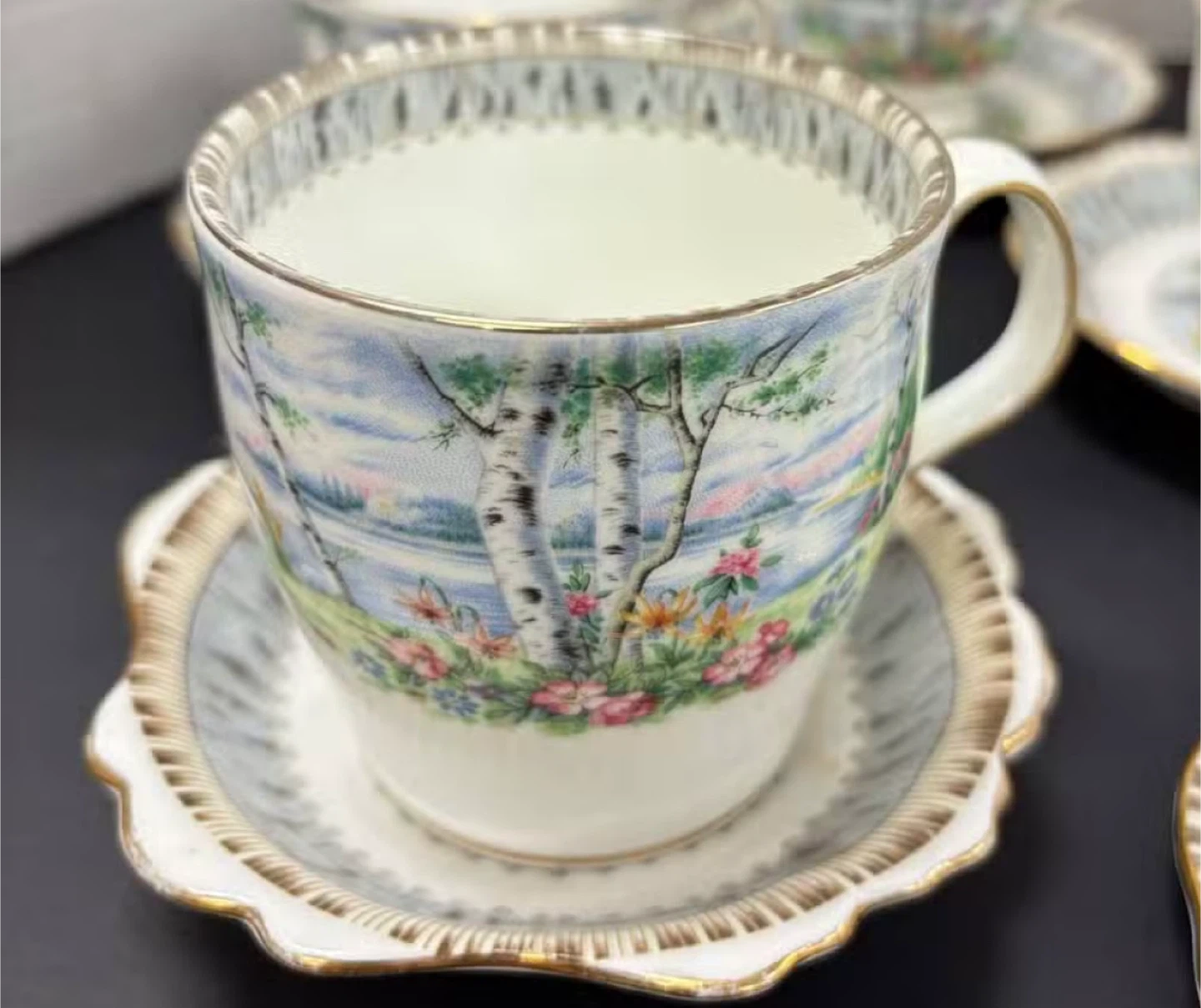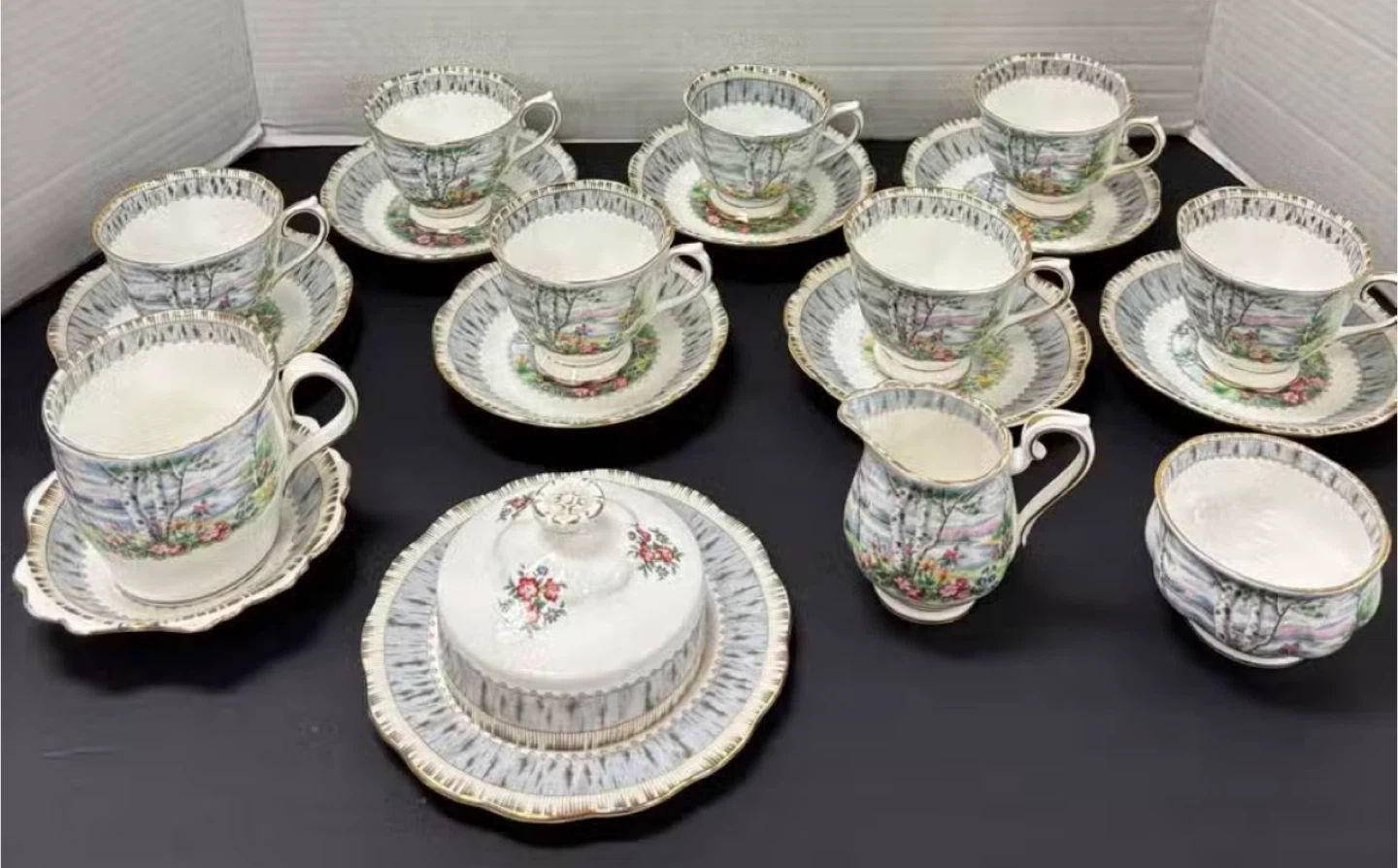 ROYAL ALBERT Beautiful vintage tea set featuring a scenic landscape design with birch trees and flowers. Includes multiple cups and saucers, a creamer pitcher, a sugar bowl, and a lidded serving dish. Porcelain construction with gold trim.