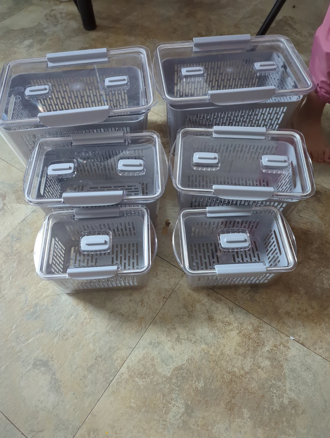 This is a set of six clear food storage containers. They come in various sizes, with an inner basket and a lid. These containers are great for keeping your fridge or pantry organized.