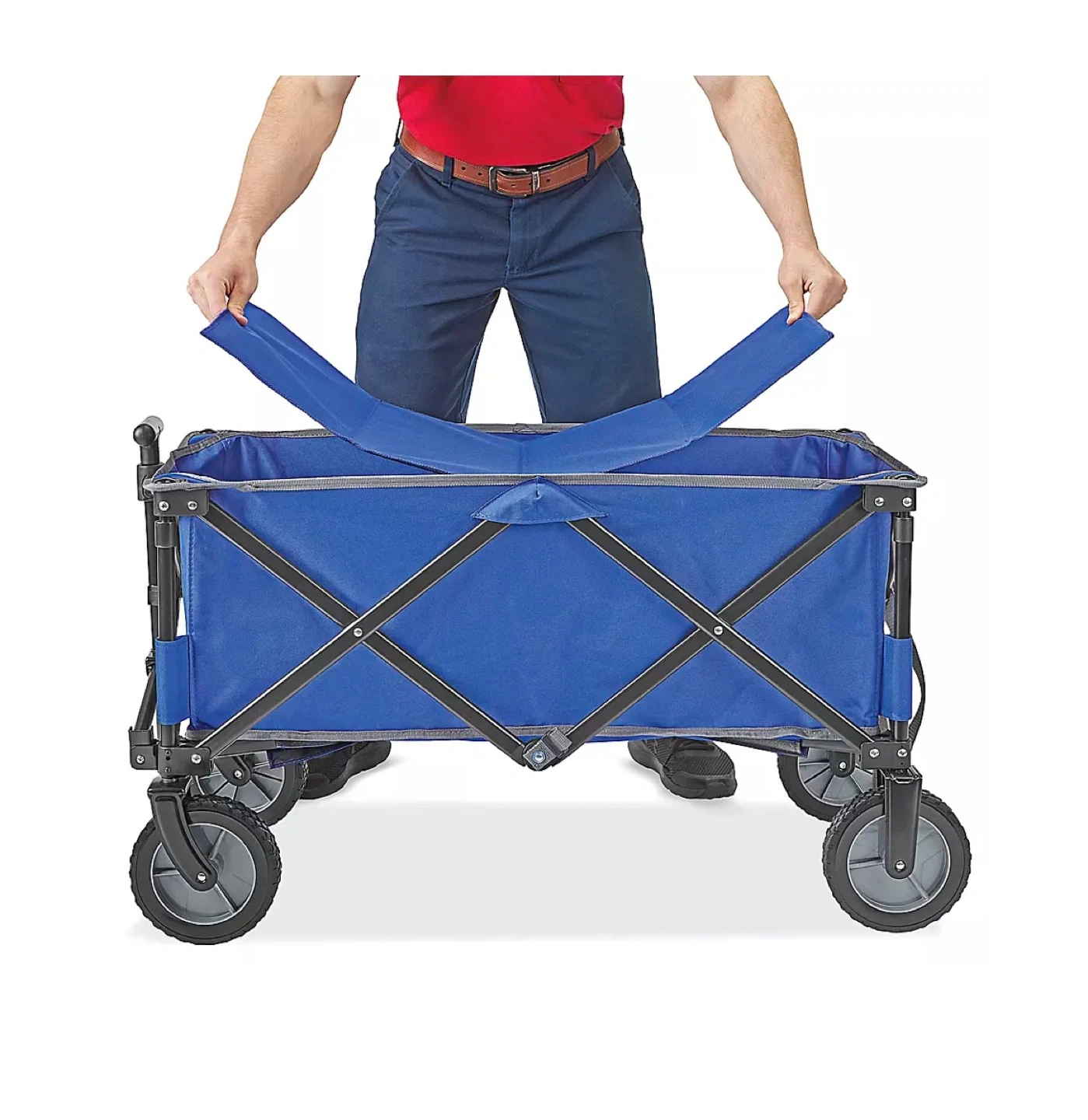 Strong steel wagon with smooth wheels and large capacity. Folds easily for storage. Great for outdoor use, shopping, camping, or garage work.