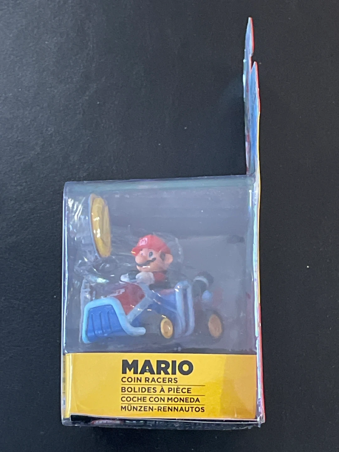 Zoom into action with this new Mario Kart Coin Racers toy! Featuring Mario in his signature kart, this pull-back racer is ready for sweet stunts and super cascades. Collect the coin, pull back and watch him go! Vroom, vroom!
