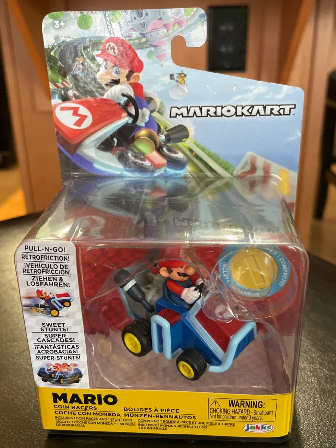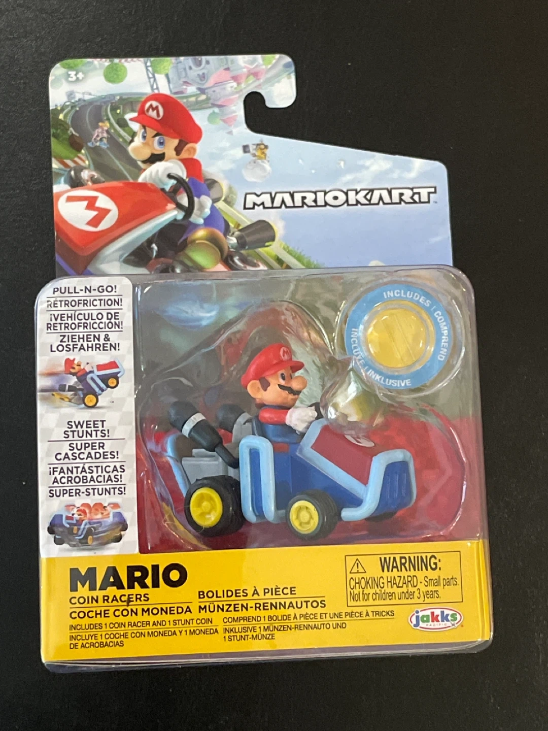 This is a Mario Kart Mario Coin Racer from Jakks Pacific. It includes one coin racer and one stunt coin. This toy is designed for children aged 3 and up. It's great for little ones or the kid in you- who love Mario Kart!