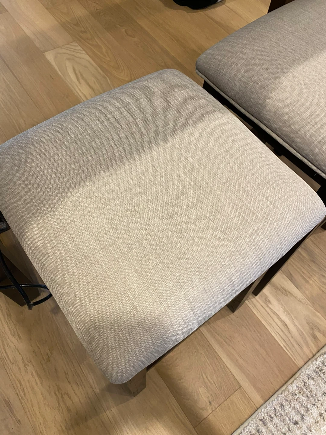 Selling a dining table with three matching stools. The table has a beautiful wood grain pattern, and the stools have light beige upholstered seats. They're in great shape and ready for a new home!