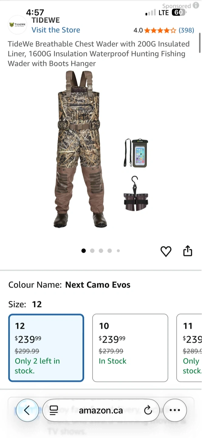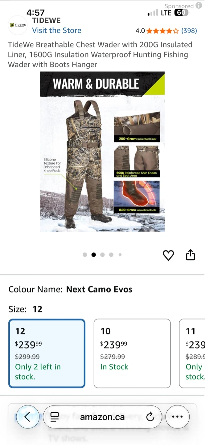 Selling a pair of Tidewe hunting waders in a camo pattern. These are size 13 and feature 800g 3M Thinsulate insulation to keep you warm and dry. The boots are made of 100% rubber with a steel shank.