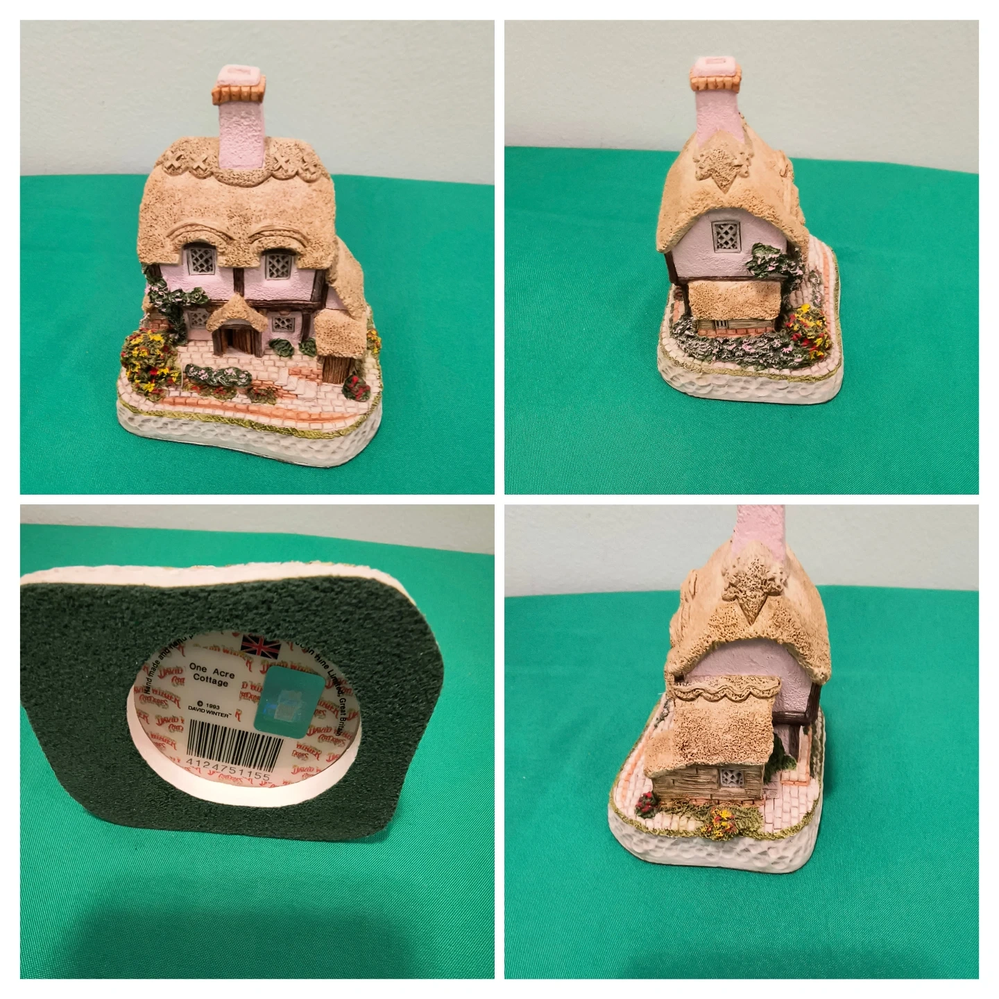 This is a David Winter "One Acre Cottage" figurine. It's detailed with a thatched roof and stone pathways. This piece was created in 1993. It's a lovely collectible for display.