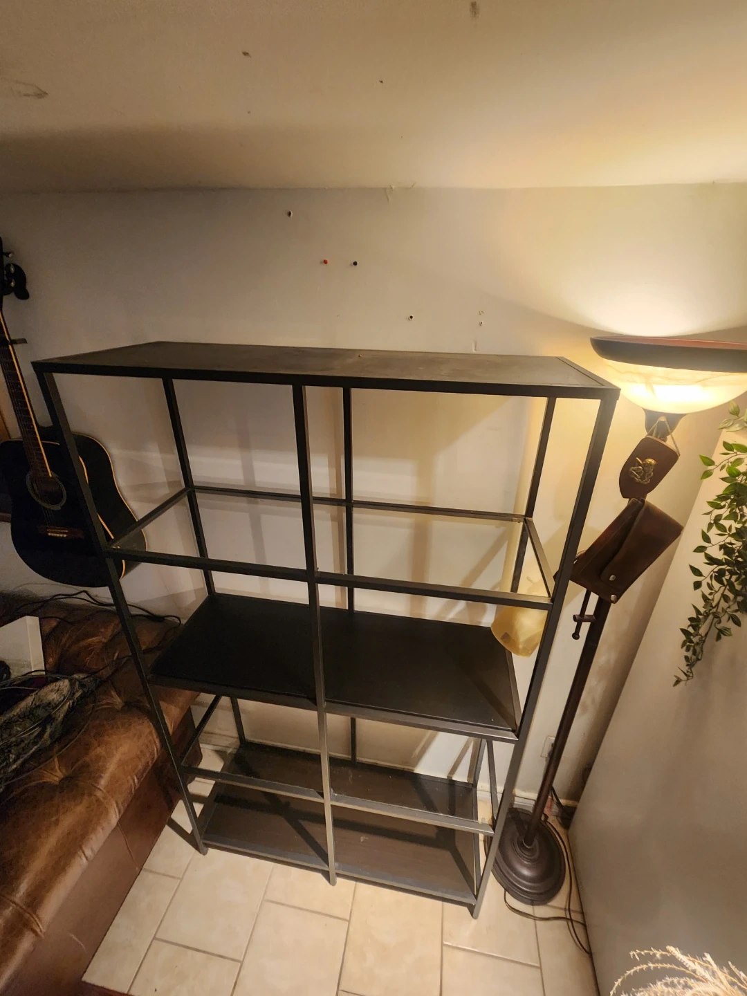 * Material: Metal frame with glass and wood shelves