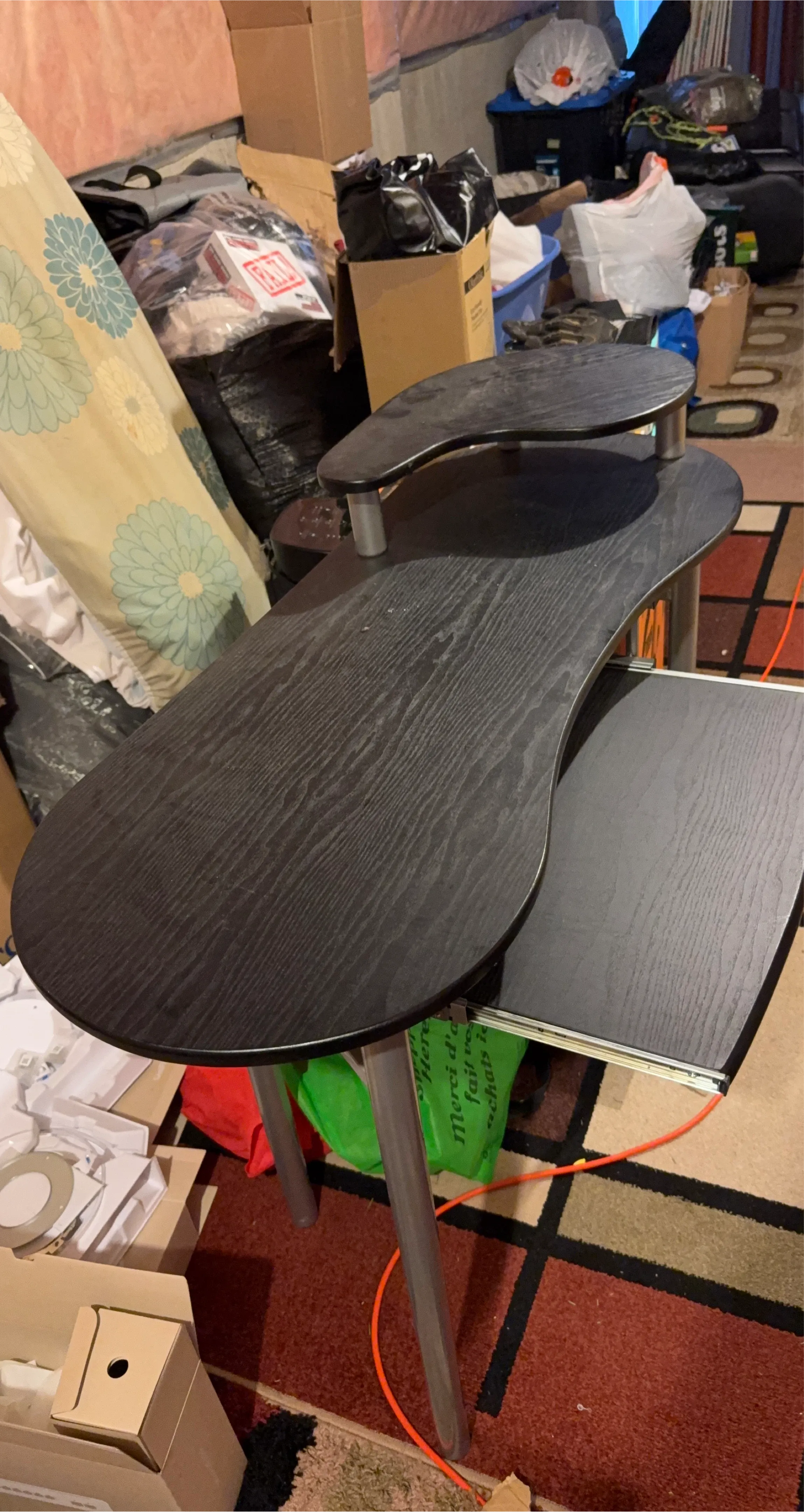 This desk features a black wood-grain finish with silver metal legs. It has a multi-level design for added surface area. The tiered shelves provide ample space for a monitor and accessories.