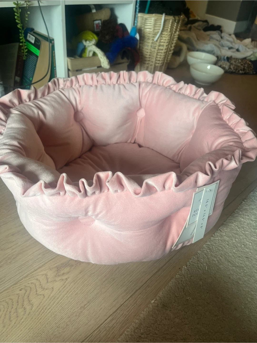 This pink pet bed has a soft velvet material and features a ruffled edge and tufted accents. It measures 16.5 inches by 14.5 inches by 8 inches. New with tags - too small for my fat cat