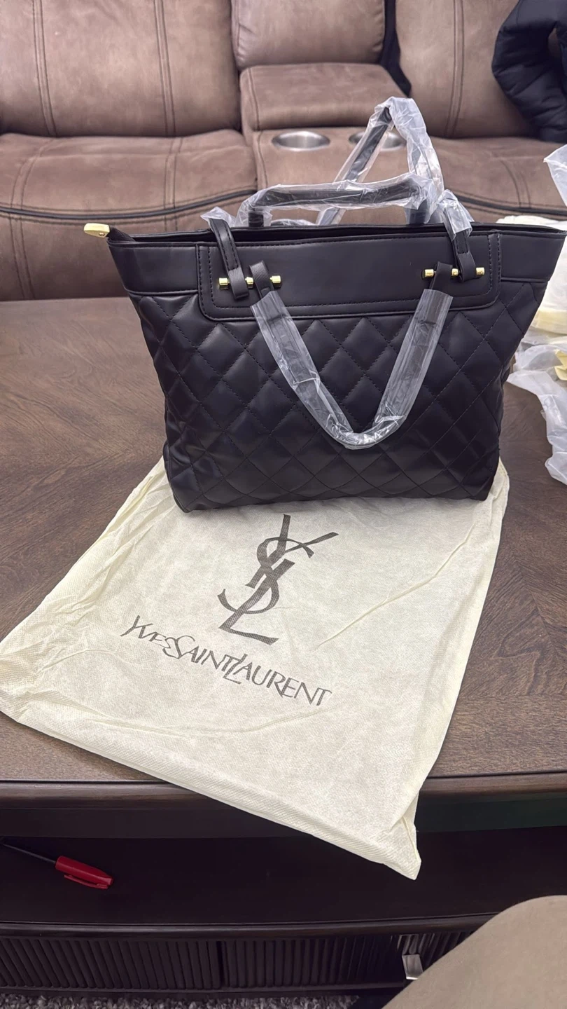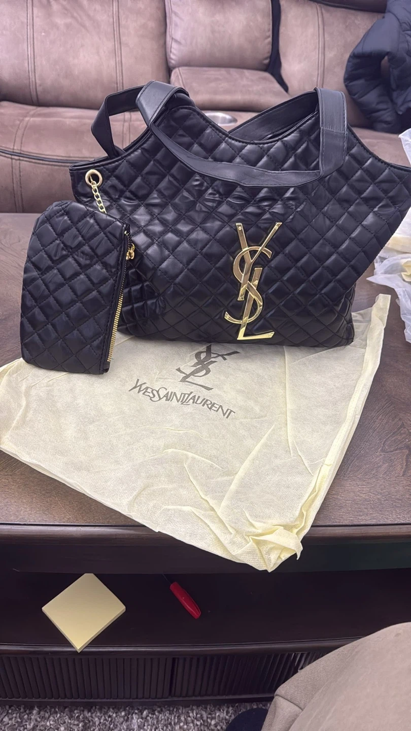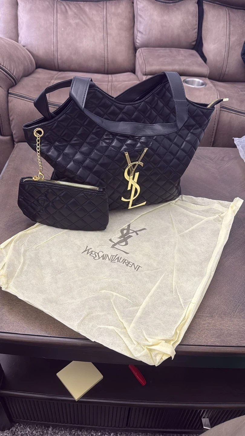 This Yves Saint Laurent tote bag is black with a quilted design and gold YSL logo. It comes with a matching zippered pouch and a dust bag. Bag features top handles and a zip closure.