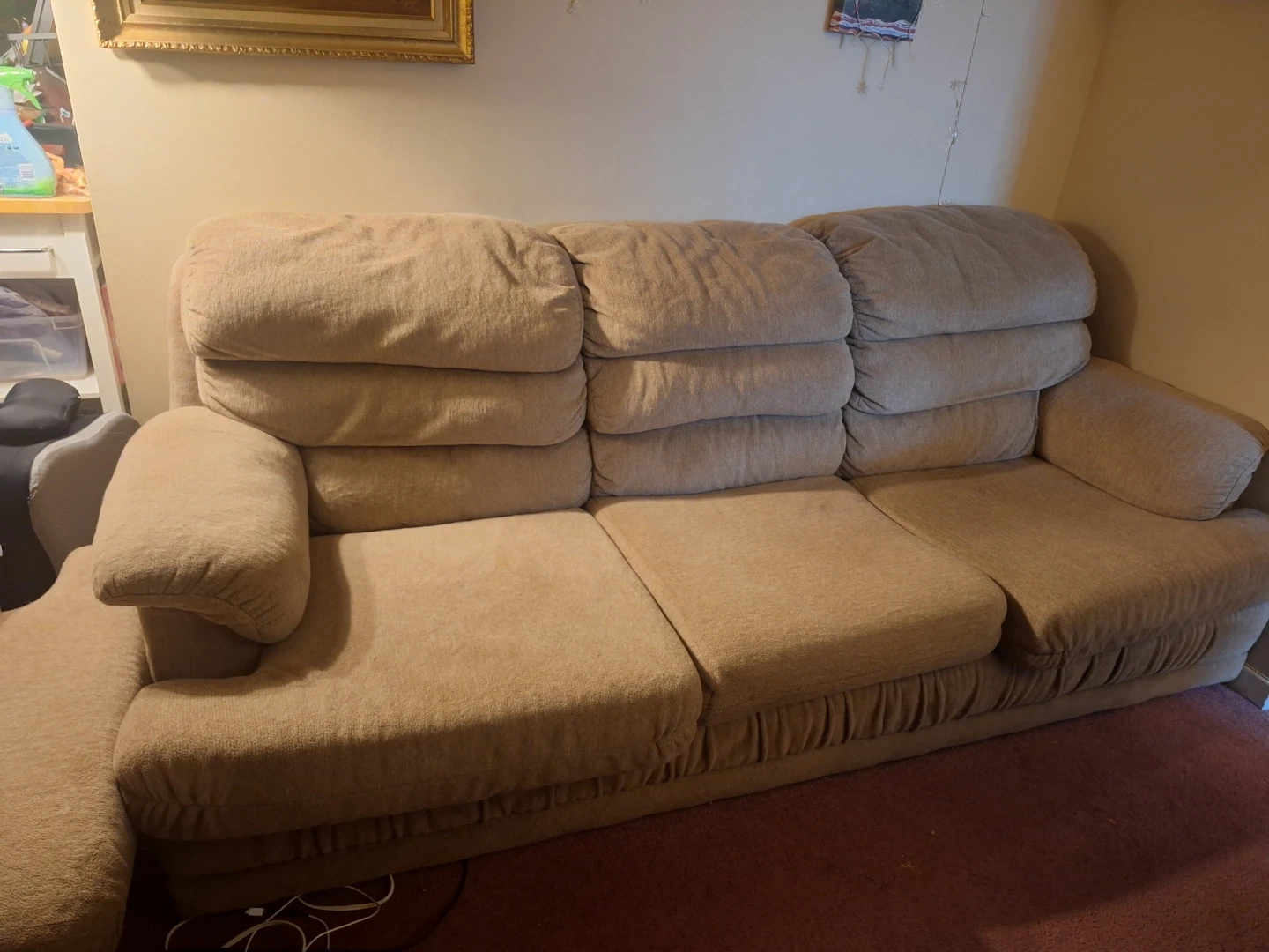 These comfortable sofas offers ample seating for up to five people. It's upholstered in a textured fabric that's both durable and soft to the touch and reiforcedwooden base that has lasted for decades and is still perfectly sturdy and looks great. The plush cushions provide excellent support for relaxing evenings.
