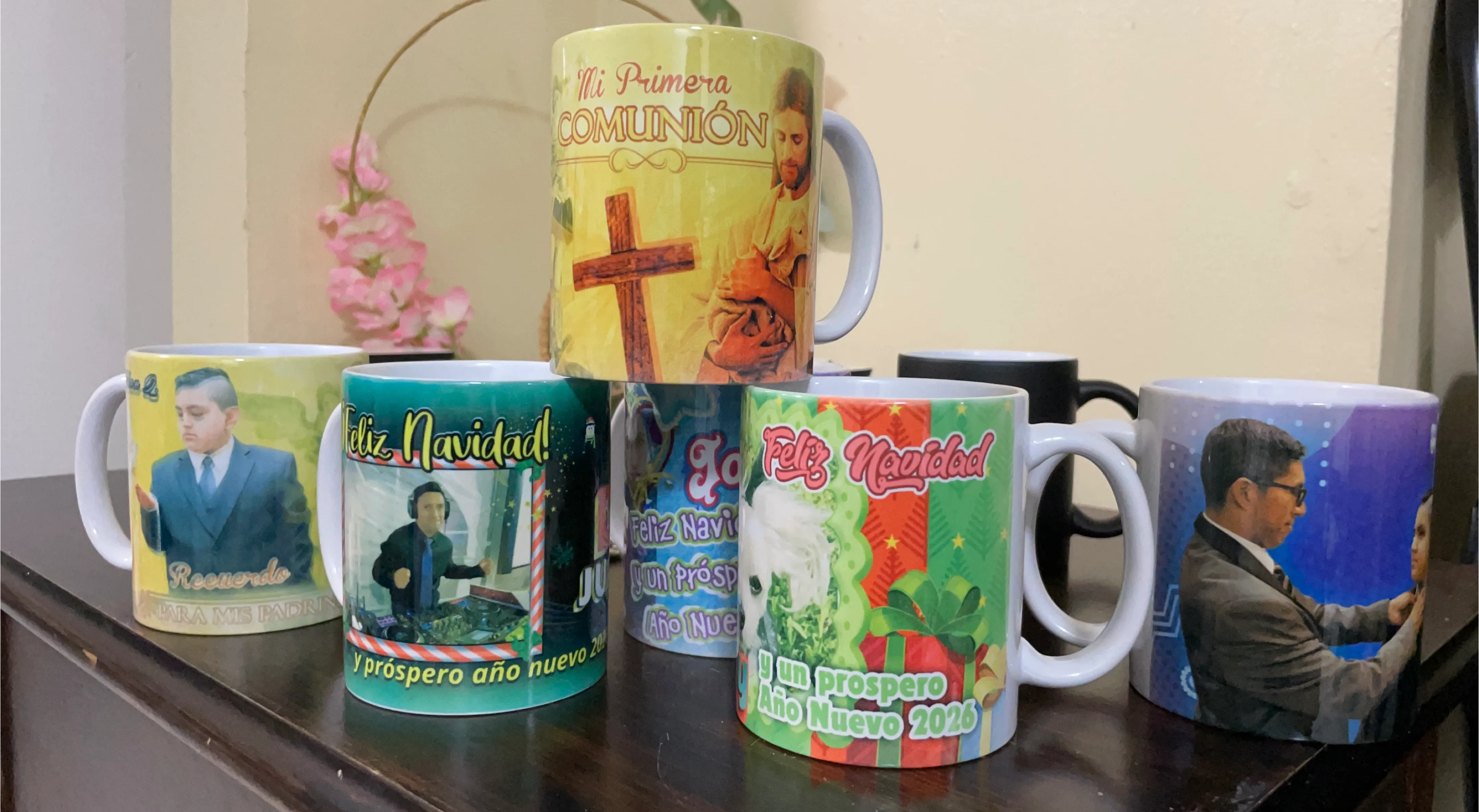 Aquí hay algunas tazas impresas a medida. Tienen diferentes diseños y colores. ¡Genial para regalos!