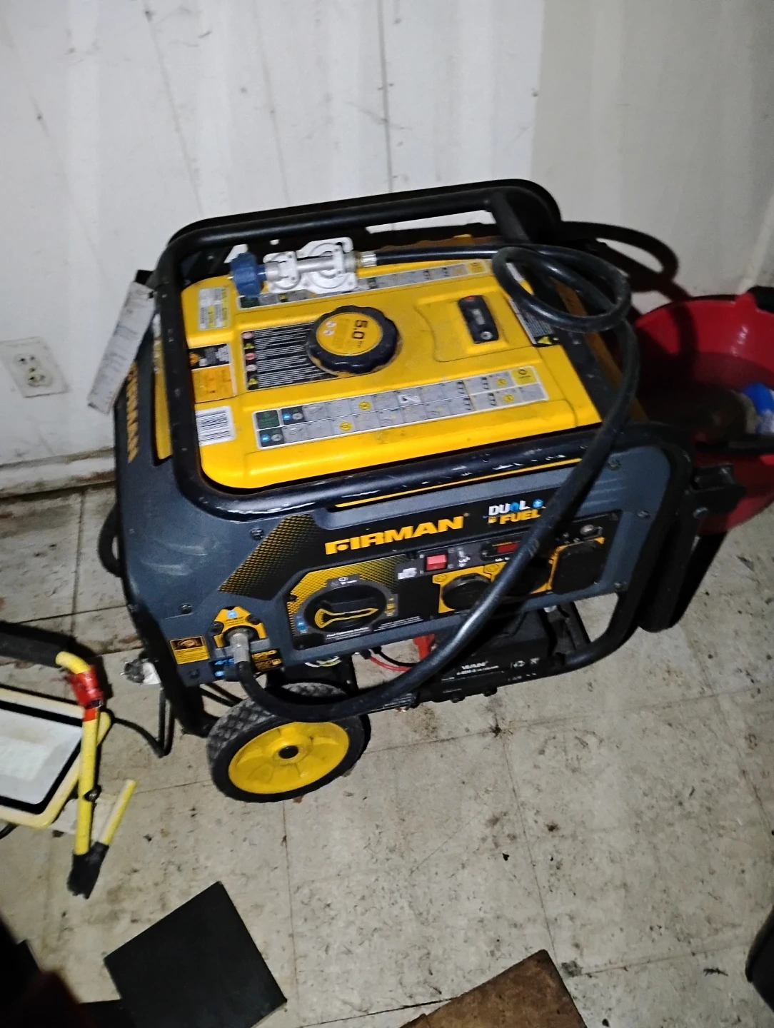 This Firman generator runs on dual fuel. It's a portable unit with wheels for easier transport. It's useful for power outages or outdoor events. Make an offer