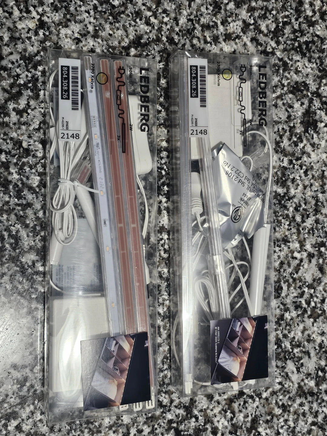 Two LEDBERG LED lighting strips. Each strip is 50cm long and includes a power adapter and mounting clips. These lights are perfect for accent lighting in cabinets or shelves.