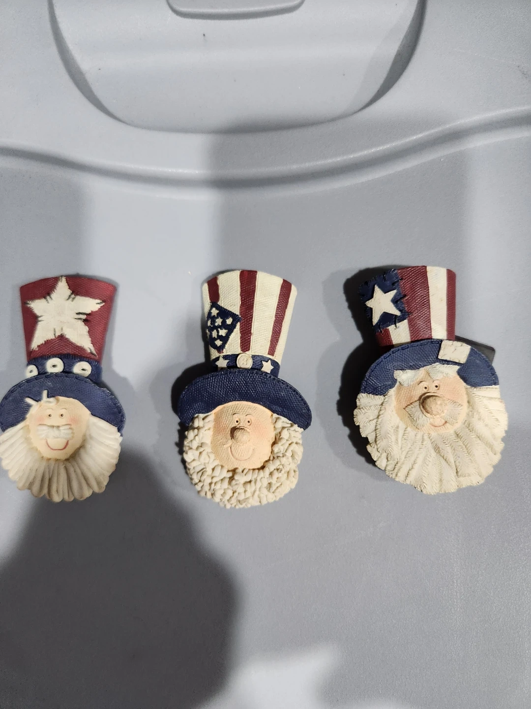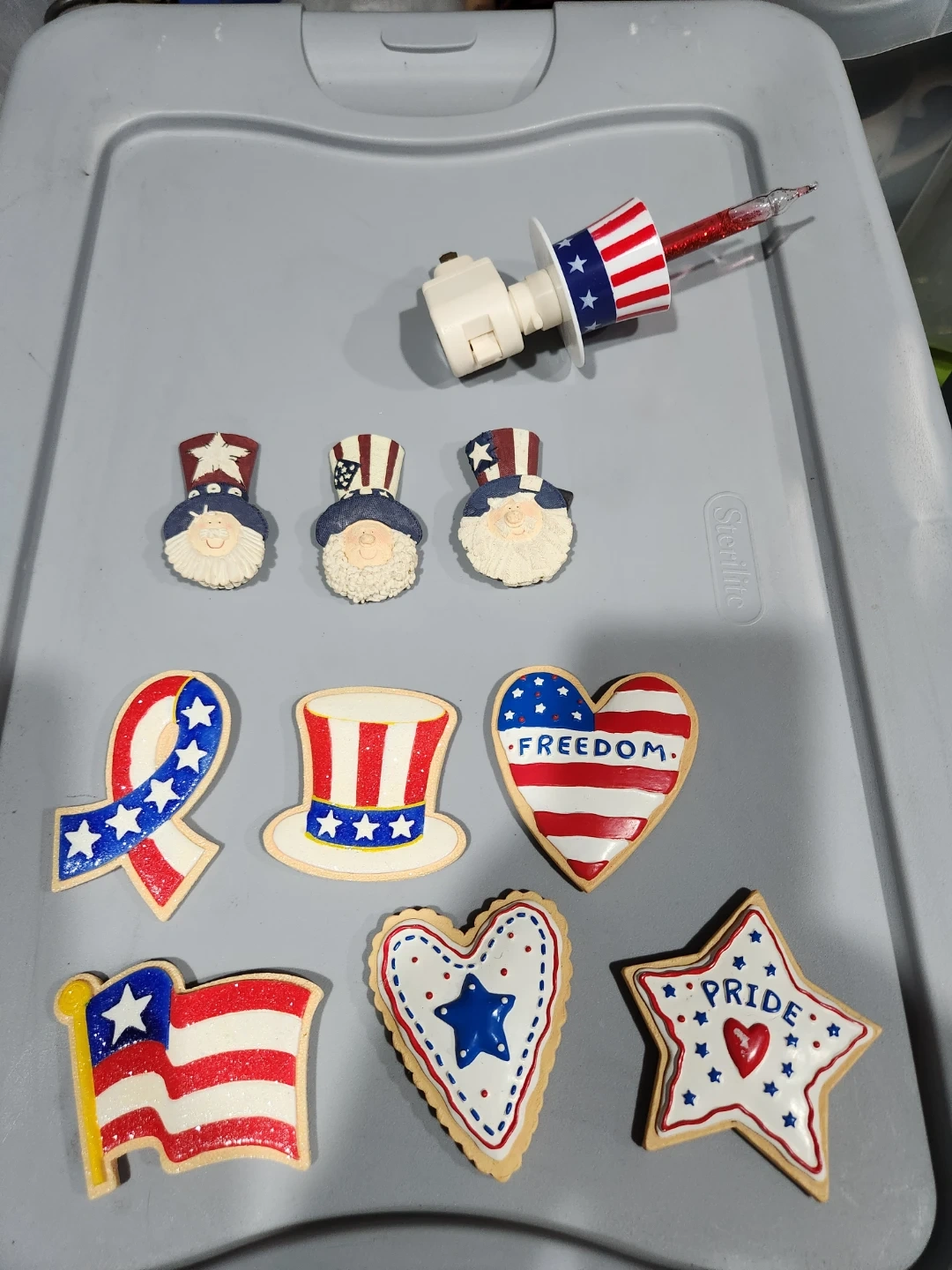 This set includes various patriotic decorations featuring Uncle Sam figures, flags, hearts, stars, and a ribbon design. Some pieces have 'Freedom' and 'Pride' text. Also includes a patriotic hat-shaped light topper.