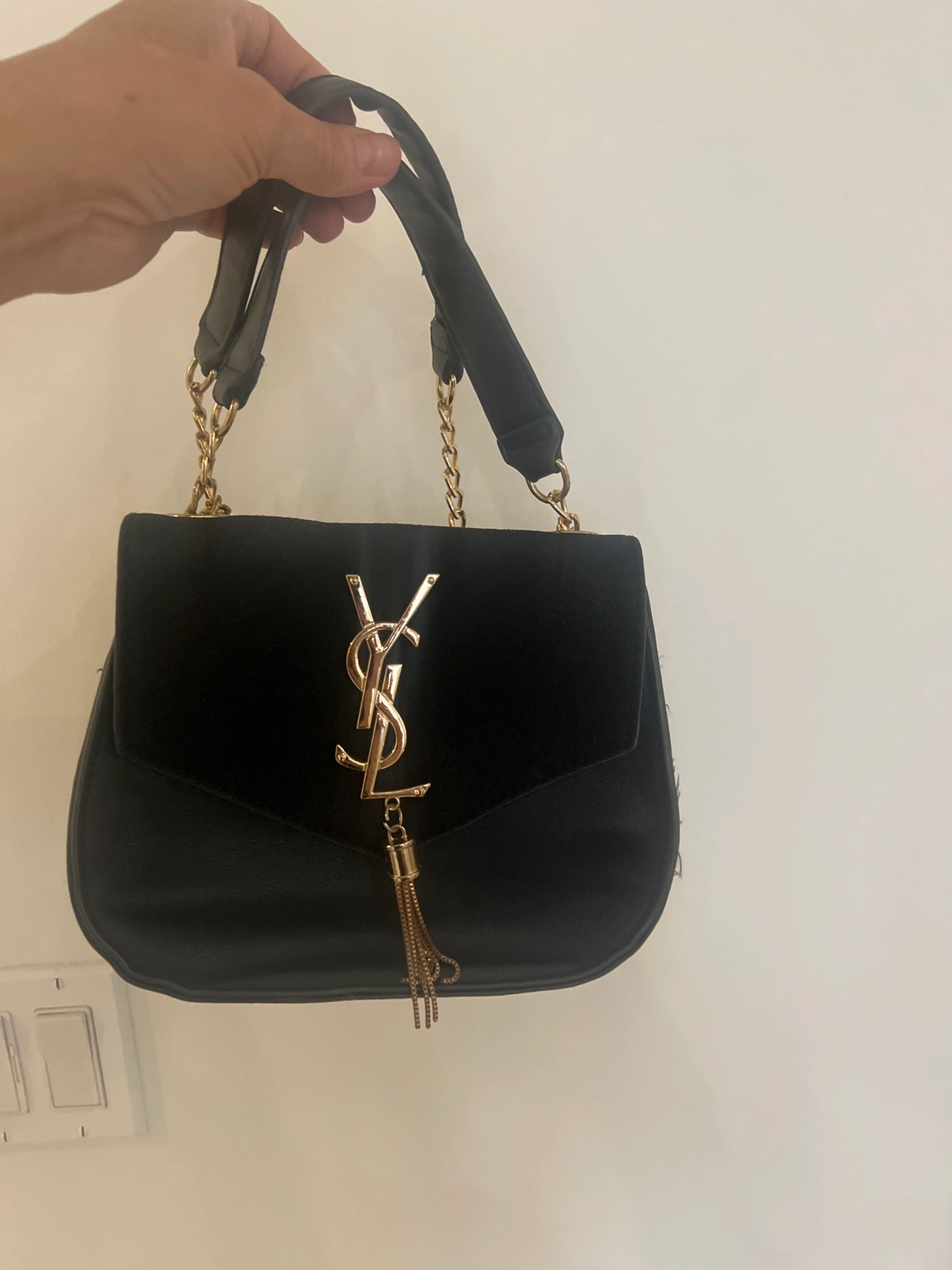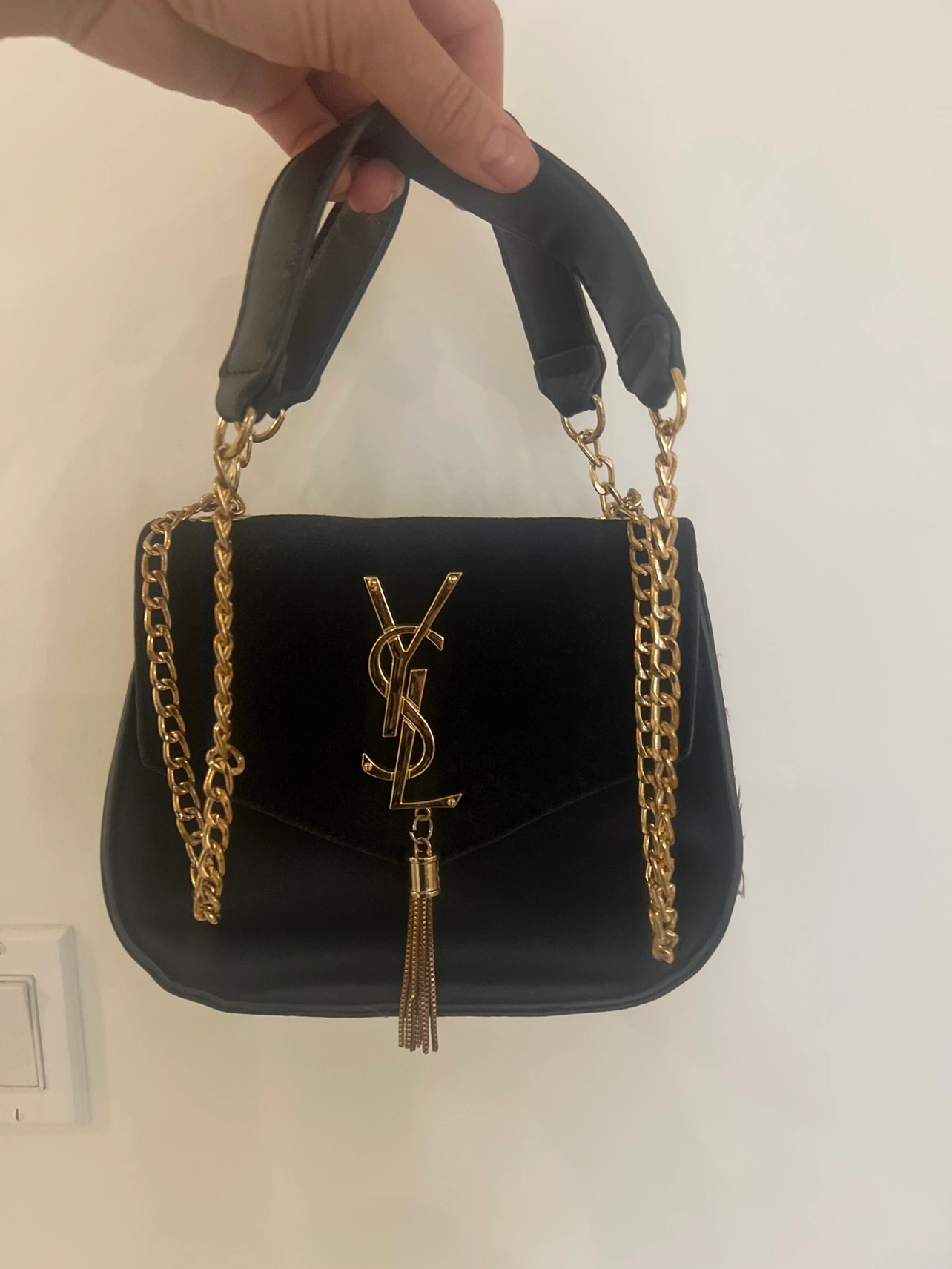 Buy & SellYves Saint Laurent HandbagYves Saint Laurent Handbag$15Black velvet handbag with gold chain strap and gold YSL logo. Please send a message if interested. WHERE TO MEET9235 Jane StView MapSELLERSepidehMaple401 review2 chats·0 favorites·80 viewsSEND CHAT TO SELLERHi Sepideh! I’m interested in your listing.Hi Sepideh! I’m interested in your listing.Get the Karrot app to chatSign In to chat