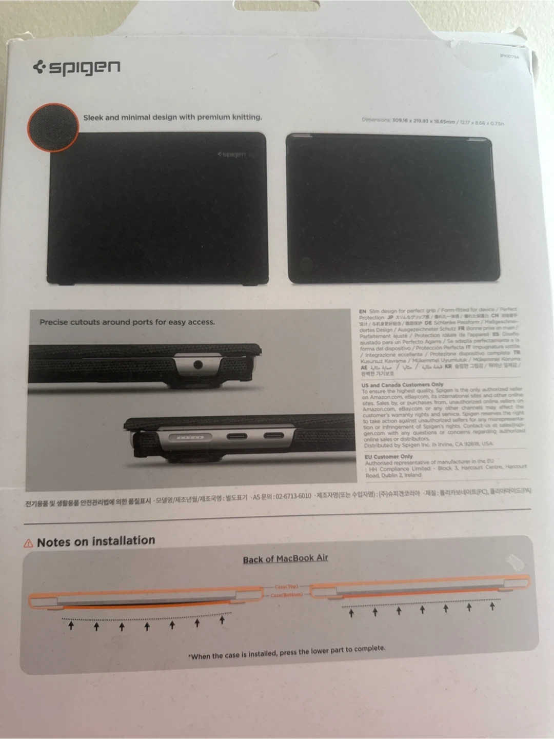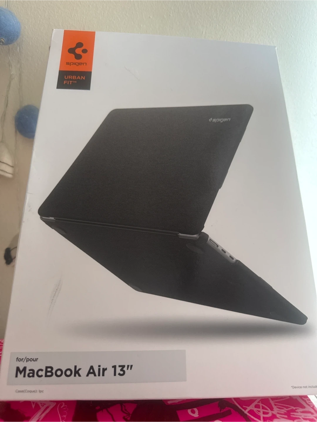 Selling a Spigen Urban Fit case for a 13-inch MacBook Air. It features a sleek and minimal design with premium knitting, and precise cutouts for easy access to all ports.