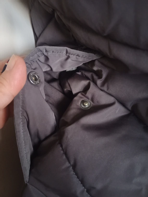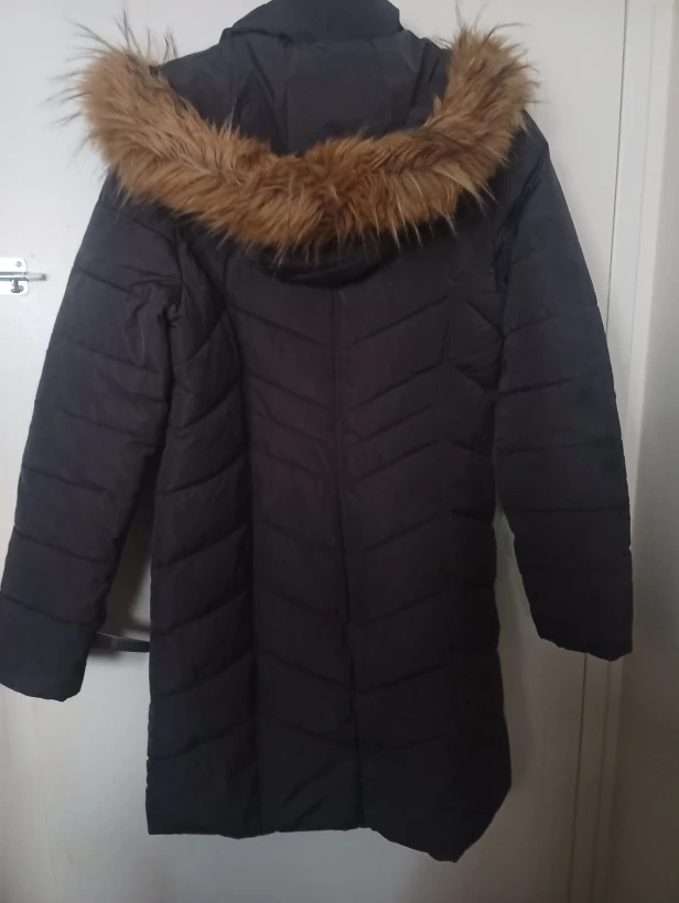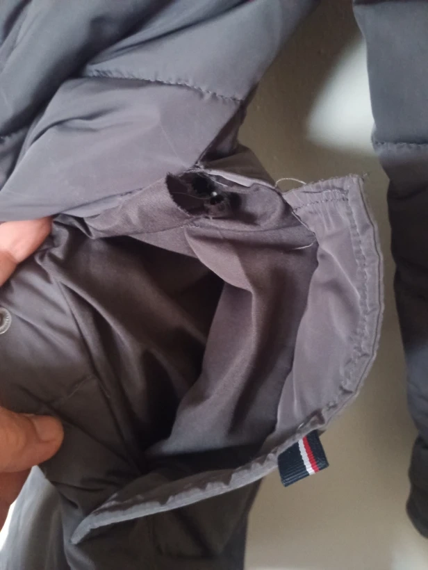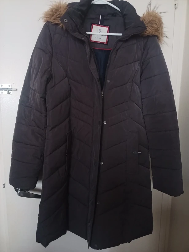 Tommy Hilfiger puffer coat in size small. It's a lovely down-filled coat, perfect for the Canadian winter. There is a hole in the seam of the lining of the right pocket, but it can be easily sewn up.