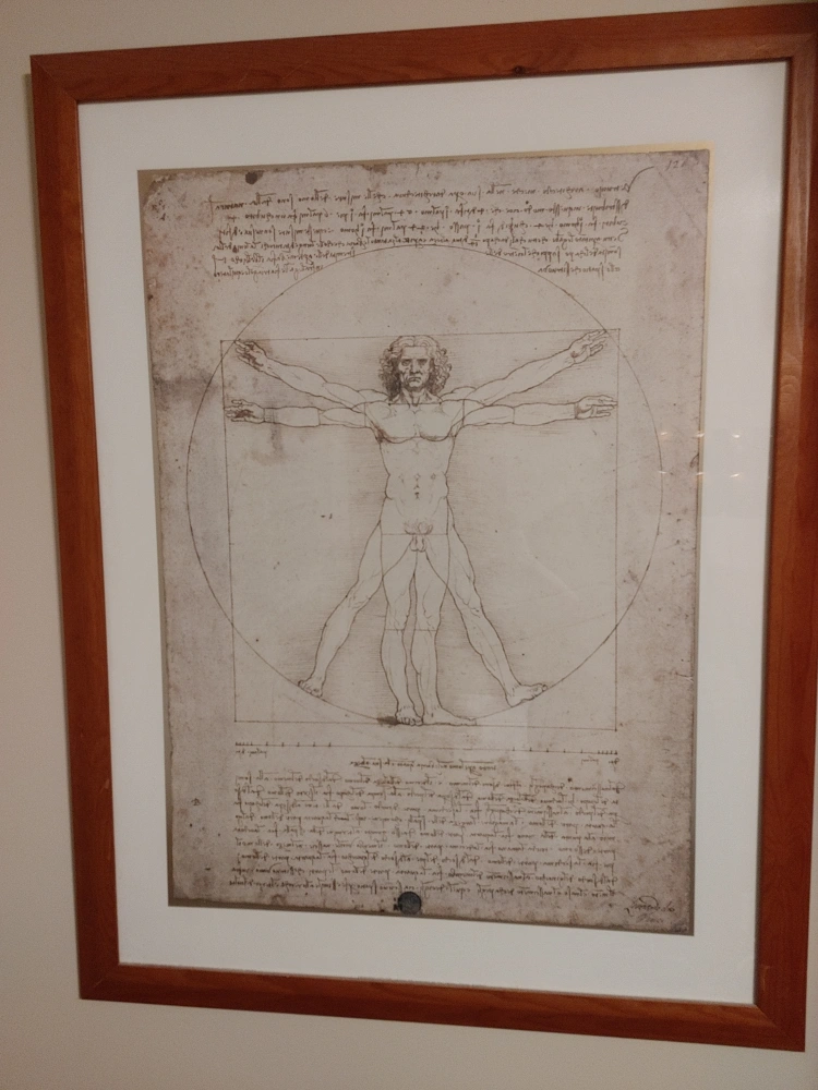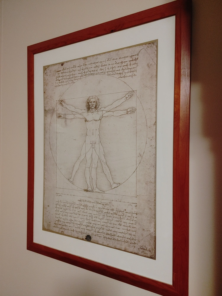 Framed print of Leonardo Da Vinci's Vitruvian Man. Brown wood frame.