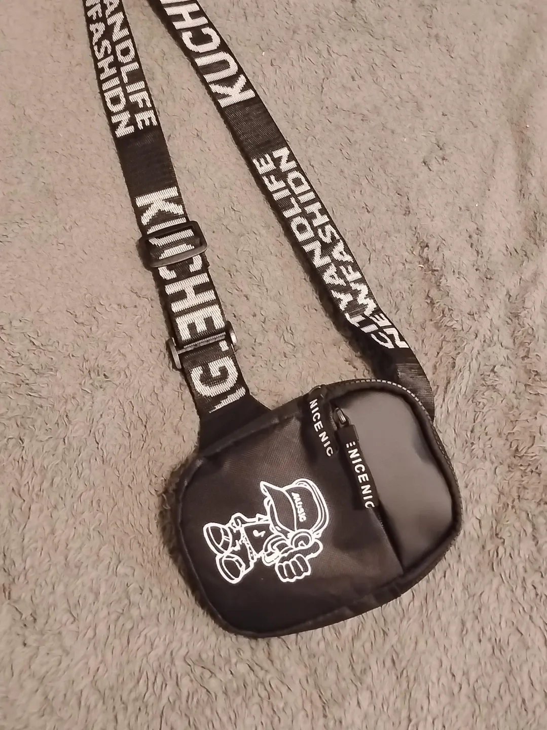 This black crossbody bag features a playful cartoon graphic and adjustable strap. It has a zippered main compartment and a smaller front pocket. The strap is adorned with repeating text for a stylish look.