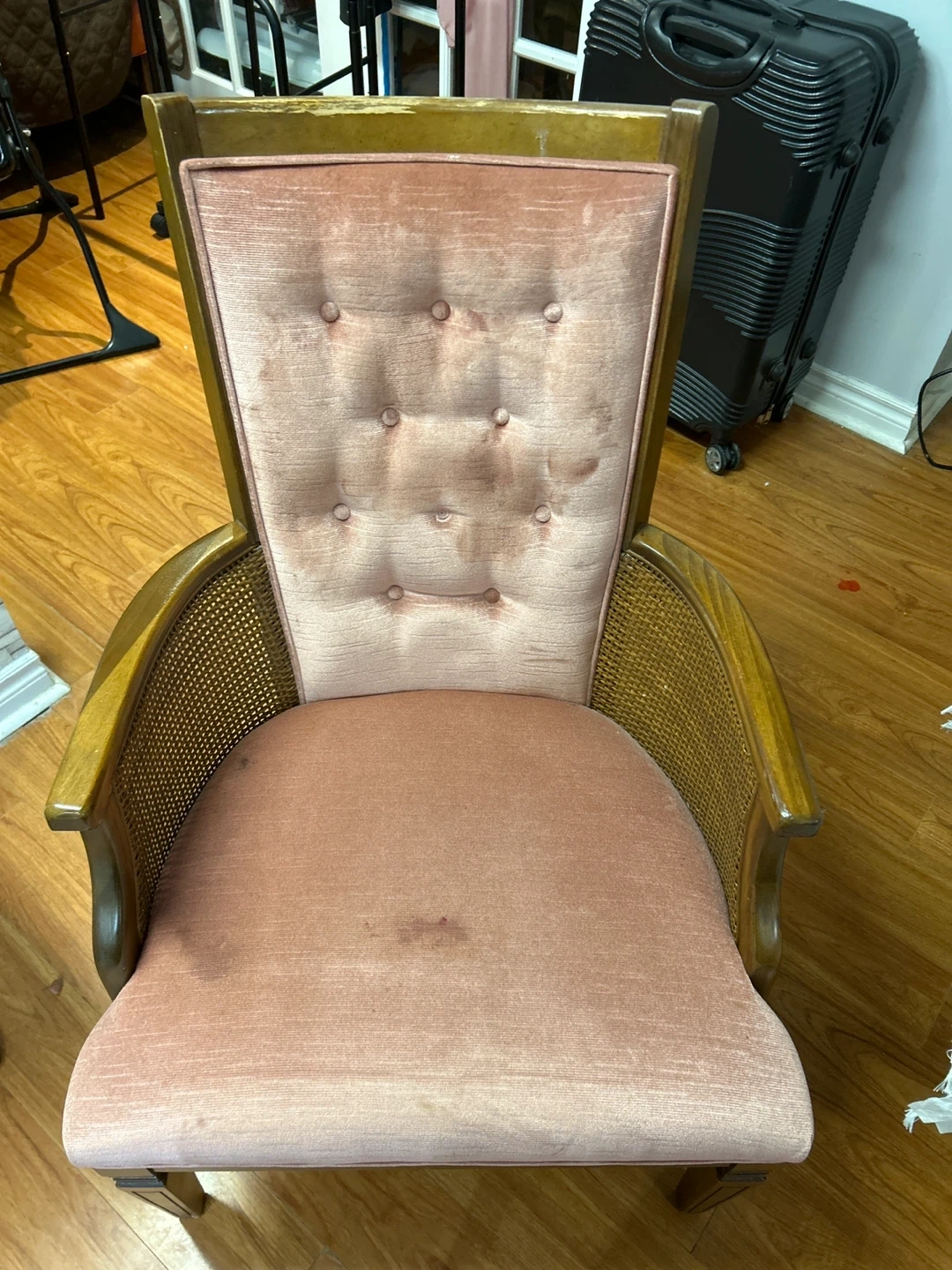 Charming vintage accent chair featuring a plush, pink upholstered seat and back with button tufting. The chair's frame is made of wood with woven cane detailing on the sides. Some staining is visible on the seat cushion and backrest, consistent with age and use. It's a lovely decorative piece for any room!