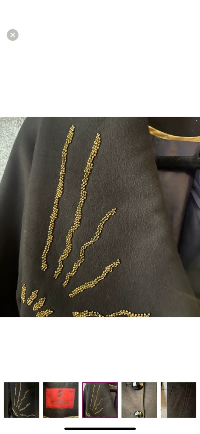 The asymmetric collar and hand-applied gold beadwork create a bold Art Deco / couture-inspired look. Beautifully shaped seams flatter the waist, while the substantial fabric gives the coat presence and elegance.