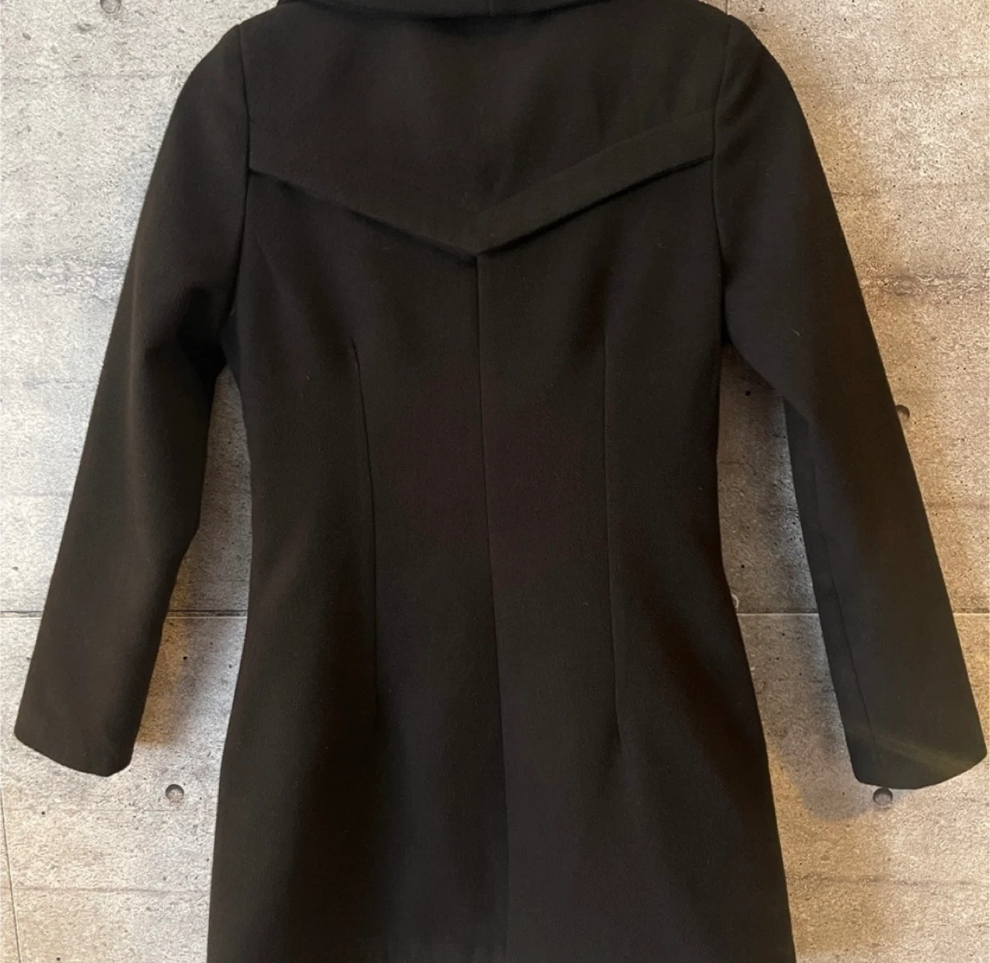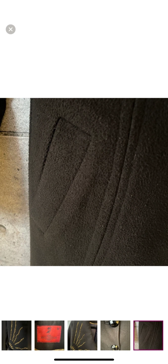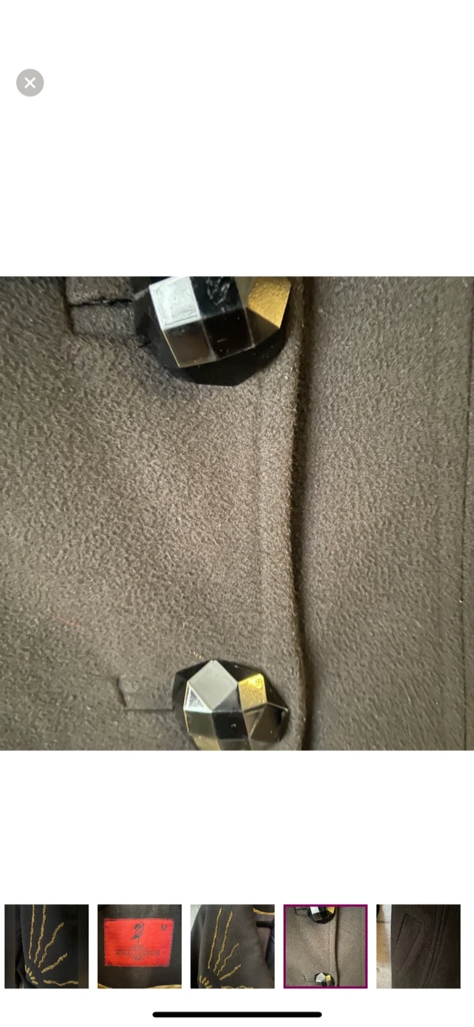 The asymmetric collar and hand-applied gold beadwork create a bold Art Deco / couture-inspired look. Beautifully shaped seams flatter the waist, while the substantial fabric gives the coat presence and elegance.