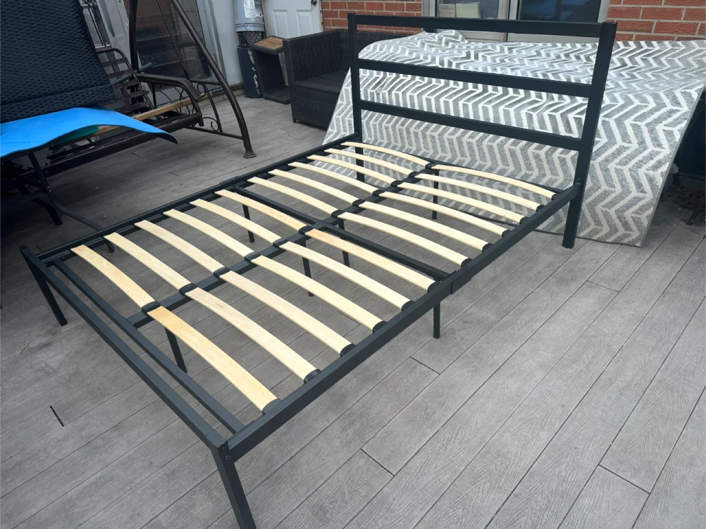 Sturdy metal bed frame with strong wooden slats. No squeaks, no damage, and all slats are solid. Assembled outdoors just for photos.