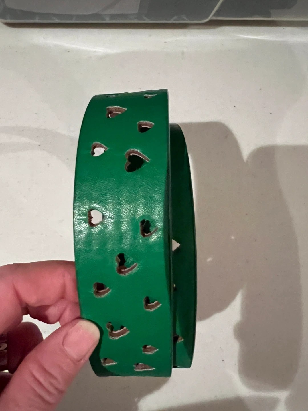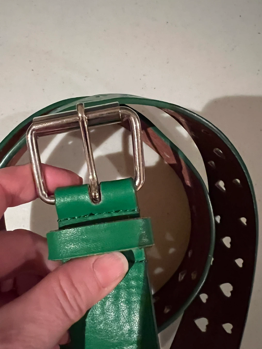 This green belt features a stylish cutout heart design. It's a size medium with a classic silver buckle. The inside is brown faux leather.
