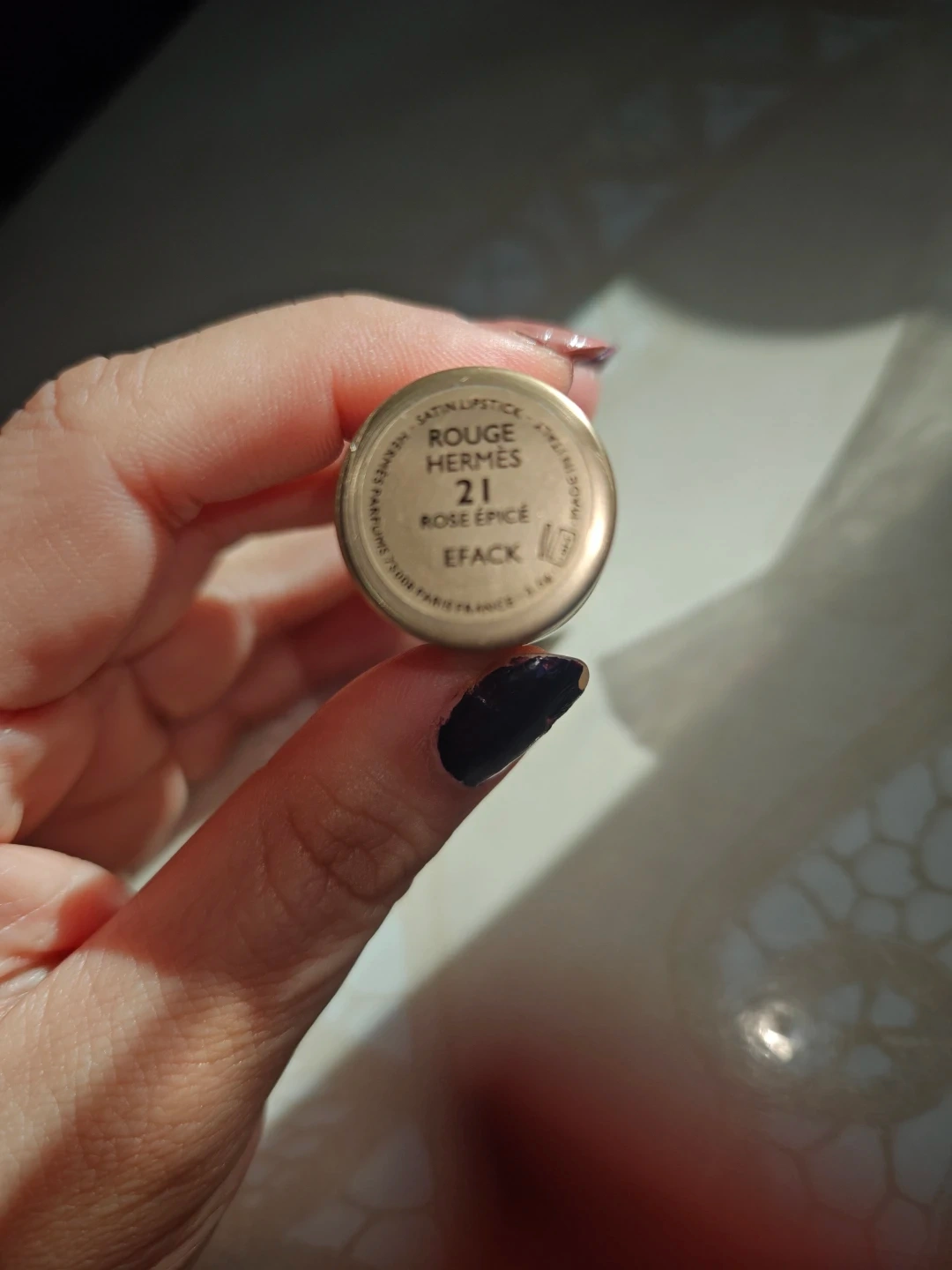 Hermès Rouge Hermes satin lipstick in shade 21, Rose Épicé. This is a refillable lipstick case. Its satin finish provides a comfortable wear. It's a great addition for any makeup collection!