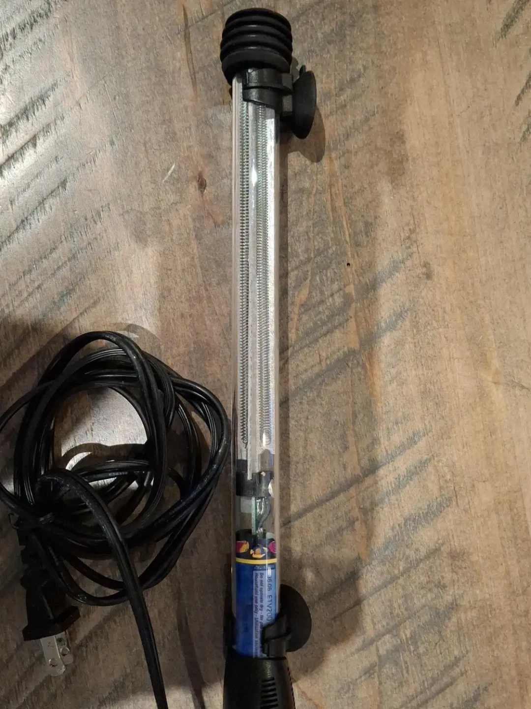 This is an Aqua-Tech 200-watt submersible aquarium heater. It's designed for maintaining consistent water temperature in fish tanks. The heater features a glass tube and includes a power cord with a plug.