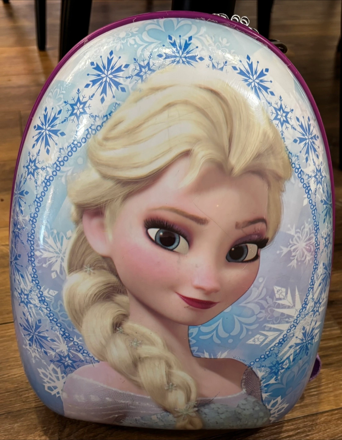 Purple Frozen backpack. Features Elsa's image. Small size, ideal for toddlers or preschoolers. Multiple compartments inside. Adjustable straps. Minor wear.