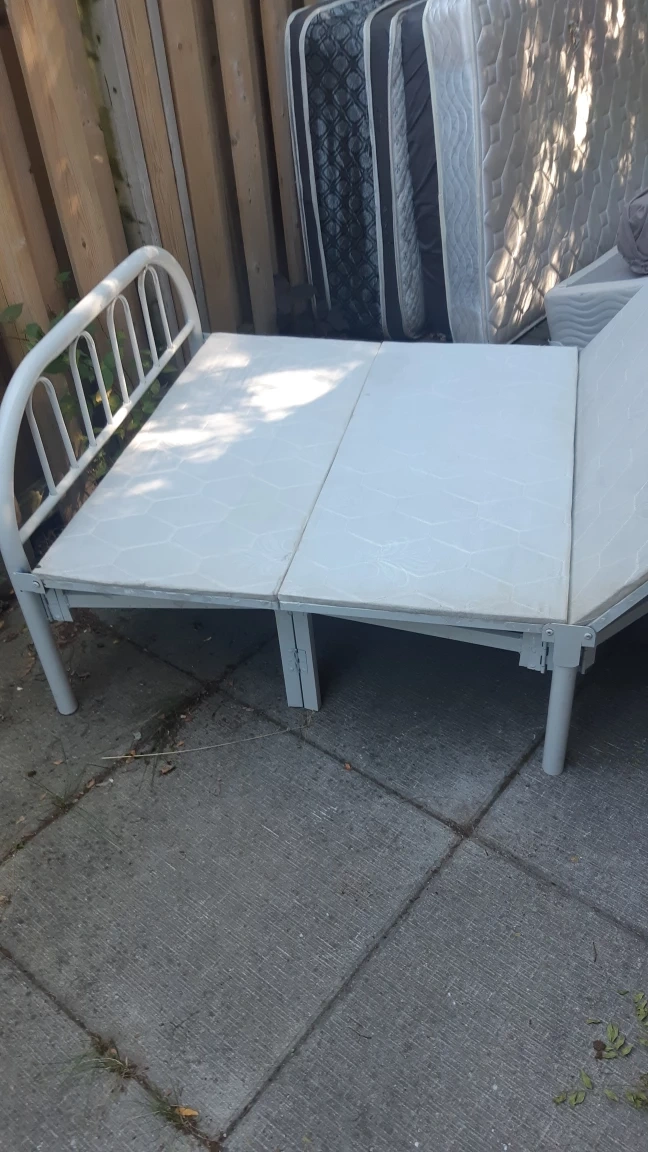Selling a white folding bed frame. It's in good condition and folds up for easy storage or transport! Great for guests or small spaces