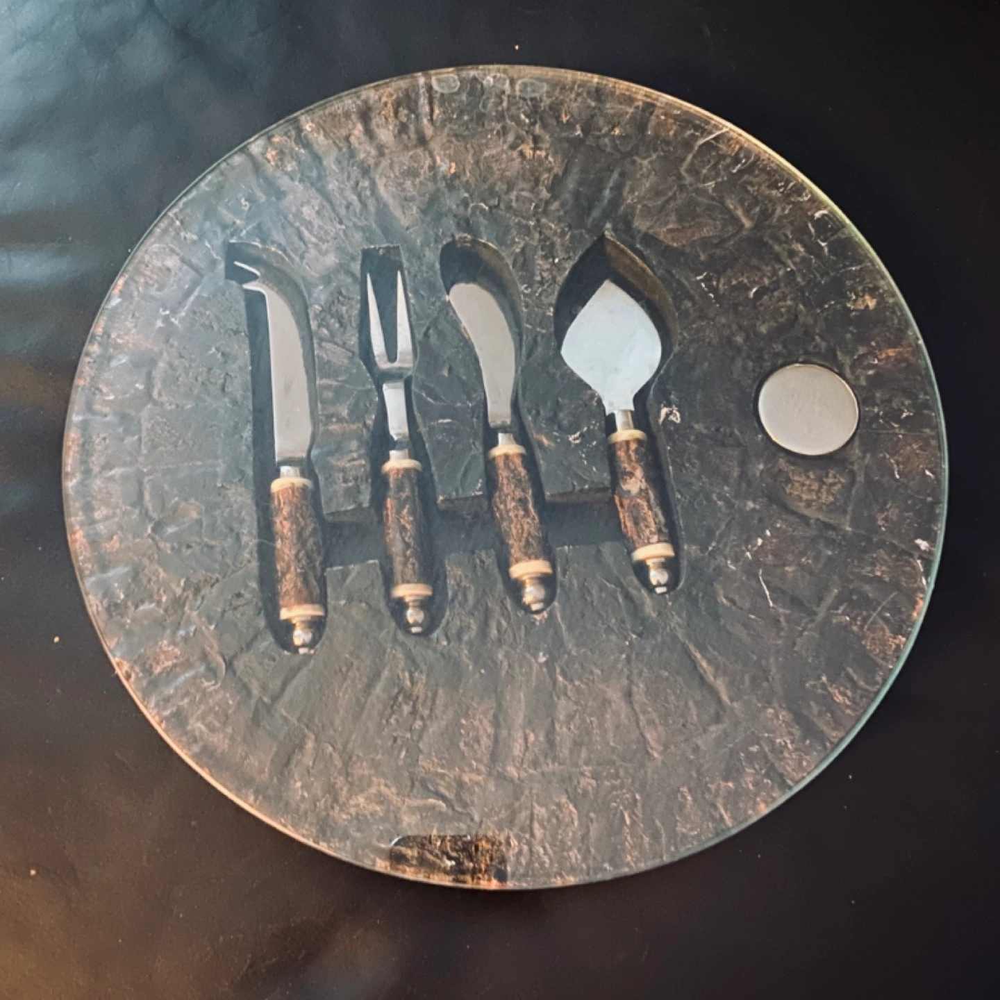 Large cheese board with a set of four knives. Excellent barely used condition. Solid, heavy and well-made. The board has a unique textured wood design, and the protective tempered glass top swivels out on a strong hinge. Four unique knives have comfortable, textured handles and sharp blades for cheese, meats, fruits and other charcuterie items. #kitchen #barware #entertaining #serving #party #dining